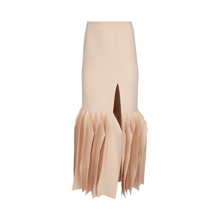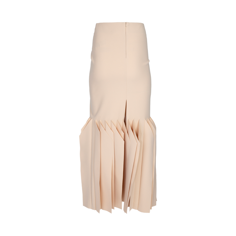 Maxi skirt with front and back slit, sculptural paneled hem and back zip.