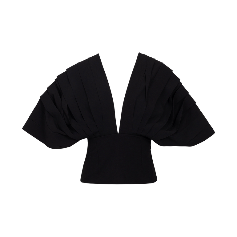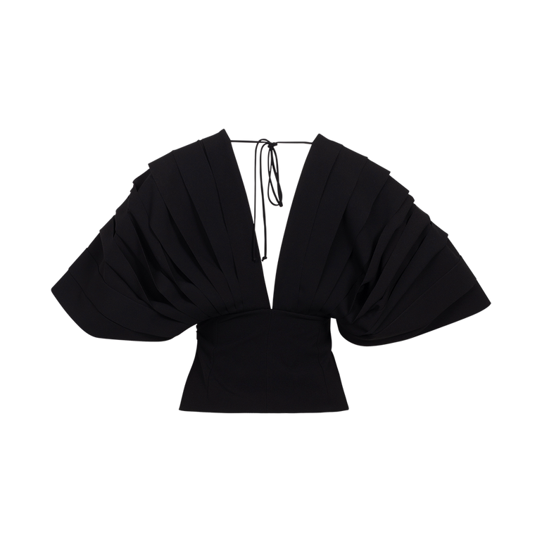 Top with short puffed sleeves, deep V-neckline and V-back with tie fastening.