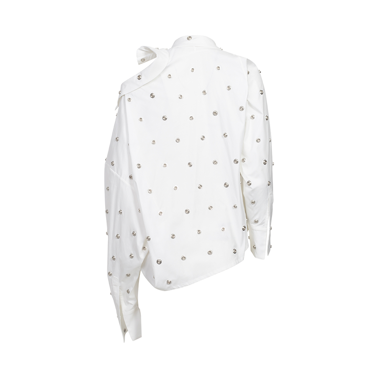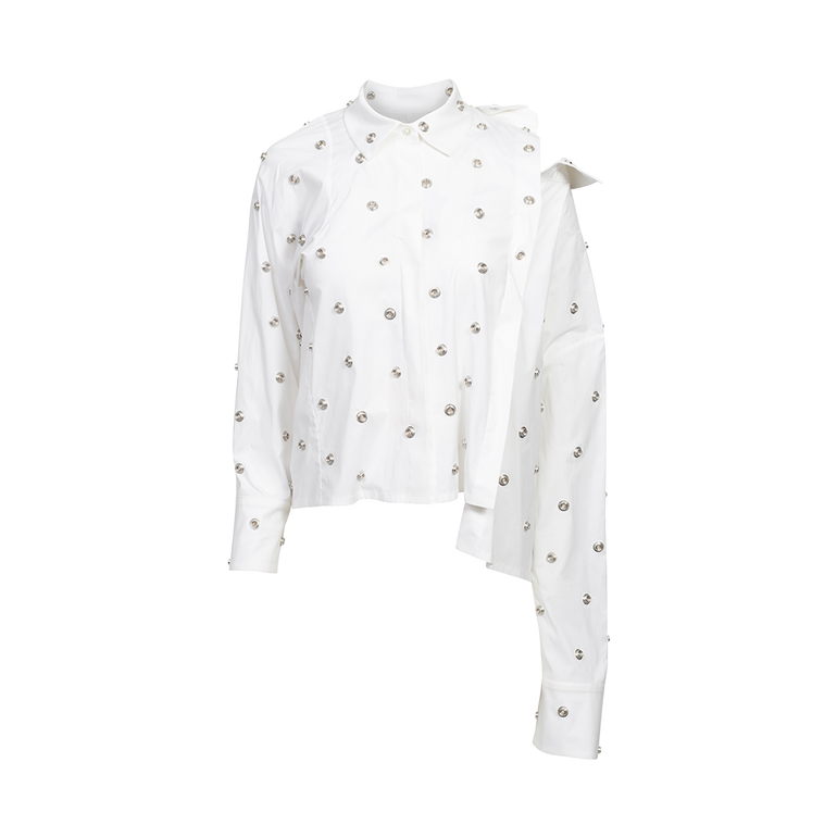 Studded shirt with button fastening at shoulder, drop shoulder and long sleeves with buttoned cuffs.