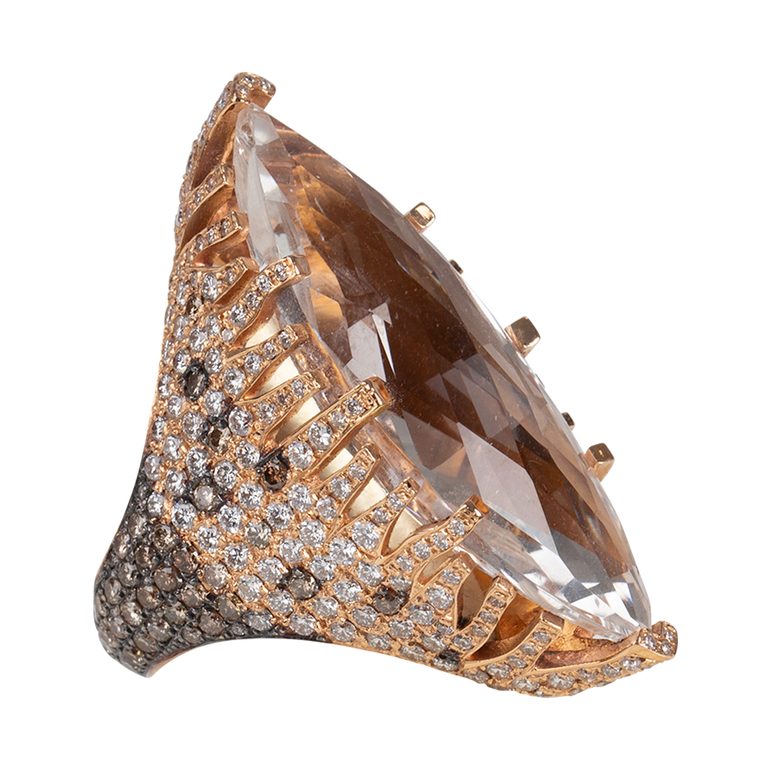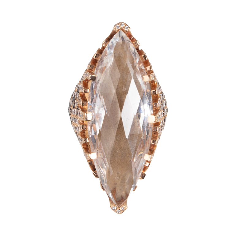 Ring with 30.96 CT. topaz center stone surrounded by 4.06 CT. T.W. diamonds.