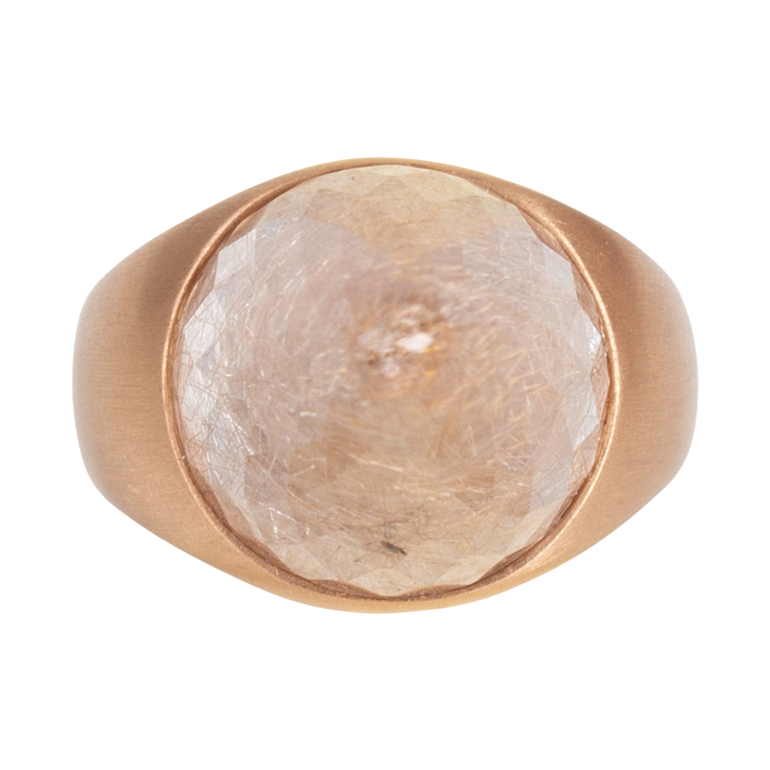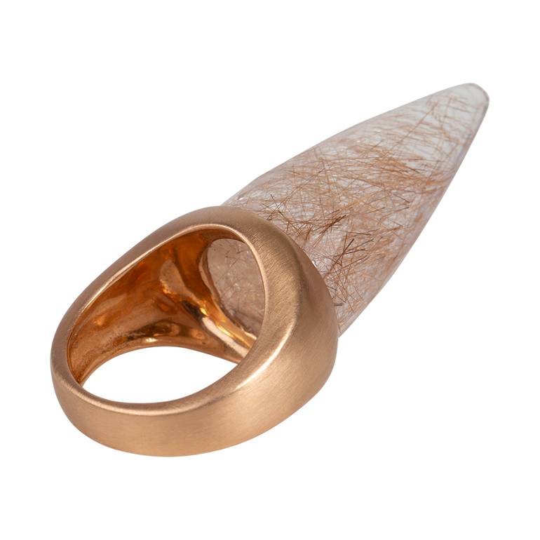 Unicorn ring featuring rutilated quartz set in 18K rose gold.