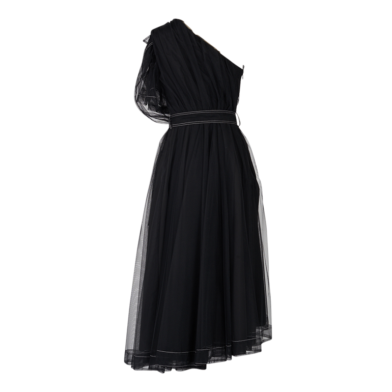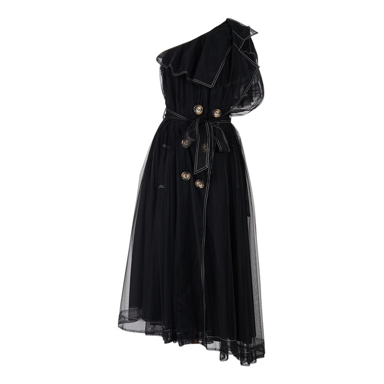 Midi length one shoulder tulle trench dress with invisible size sip, asymmetrical neckline.