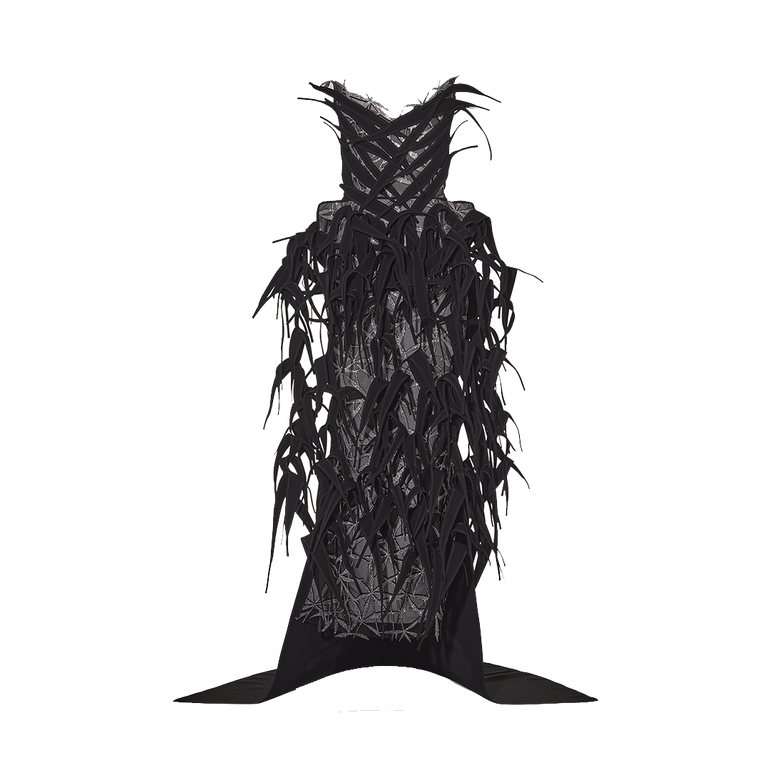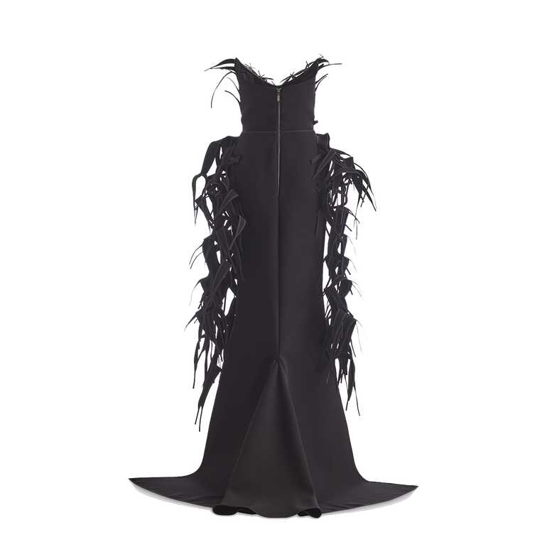 Strapless gown with leaf appliqués, structured bodice, pleated hip folds, back skirt train and zip closure. Lined.