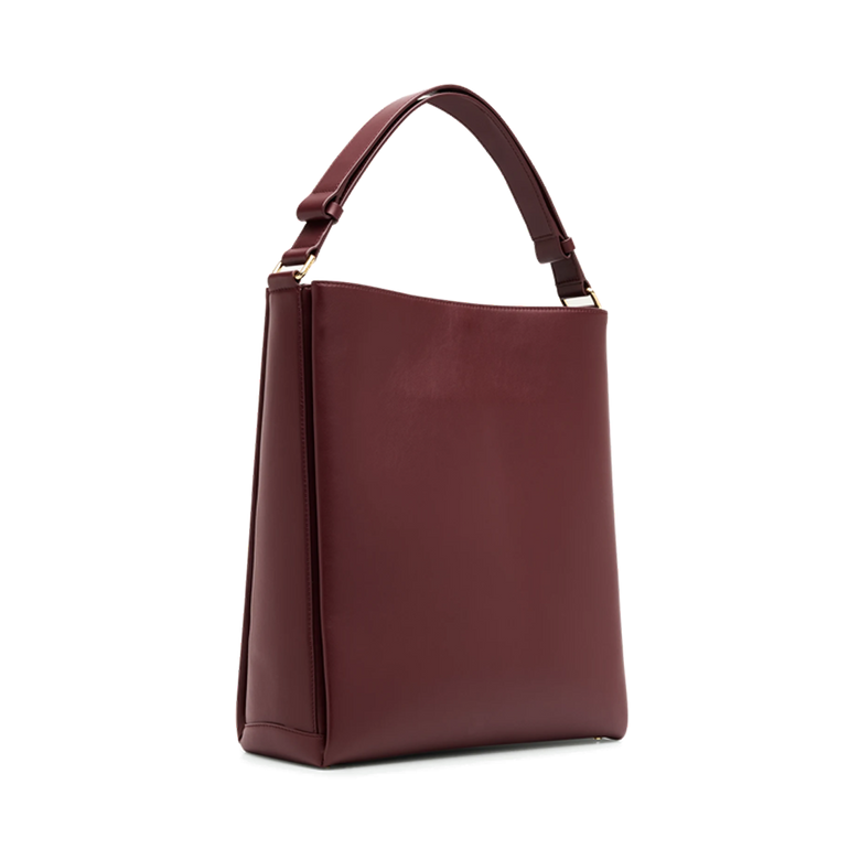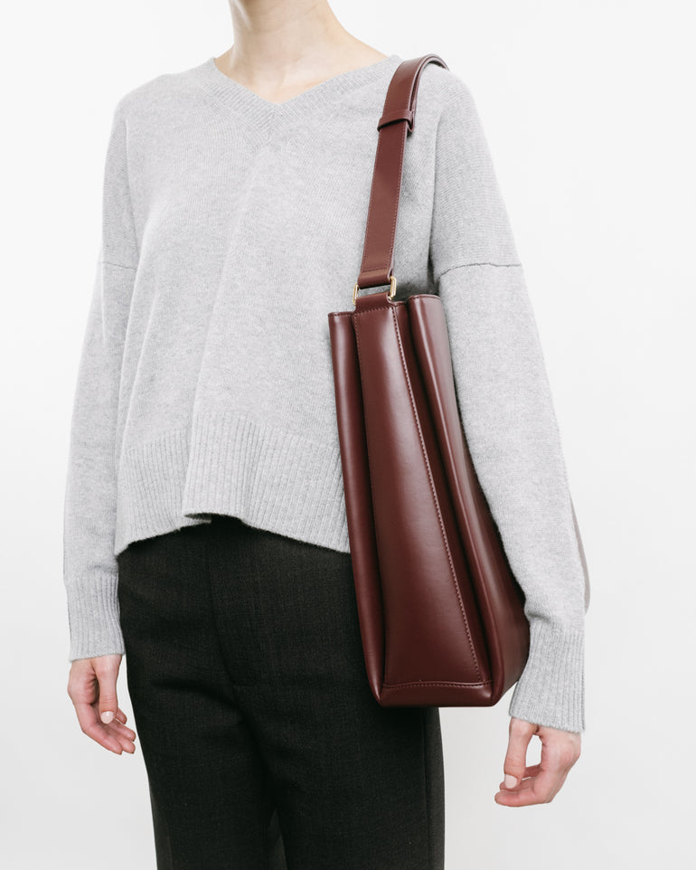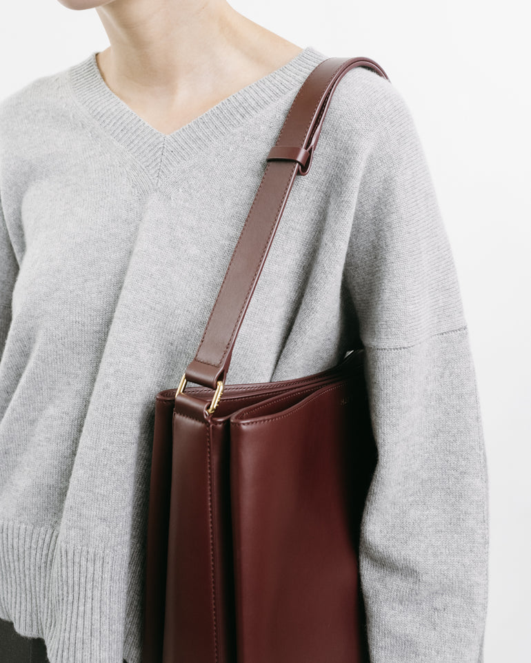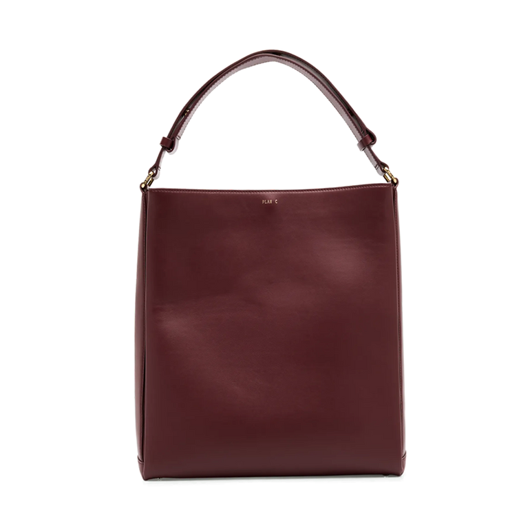 Tote bag with adjustable handle, three compartments with three pockets each and concealed gold-toned button closure. Approx. 11.8"W x 13.4"H x 4.7"D.