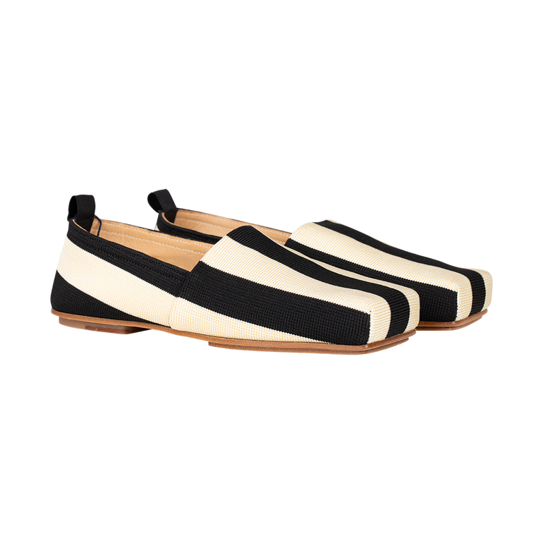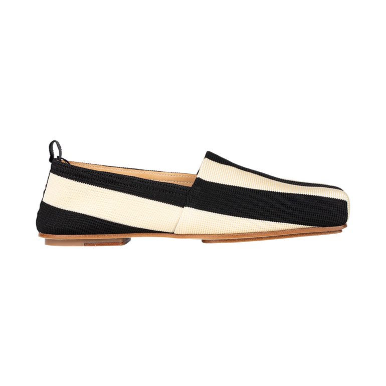 Striped espadrille with convertible heel that can be collapsed to convert to the look of a mule.