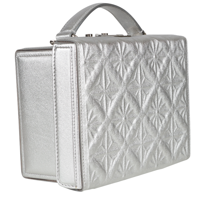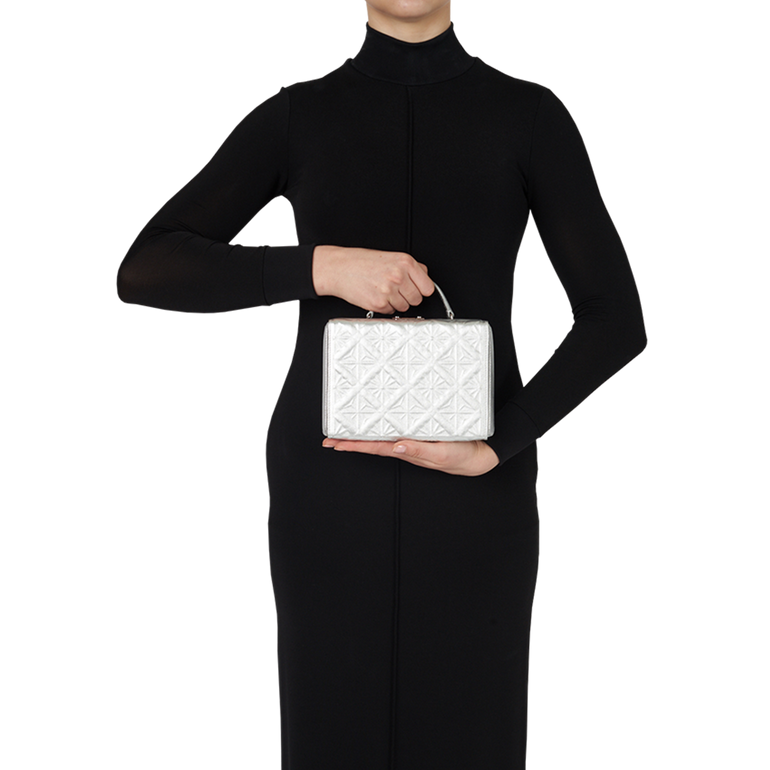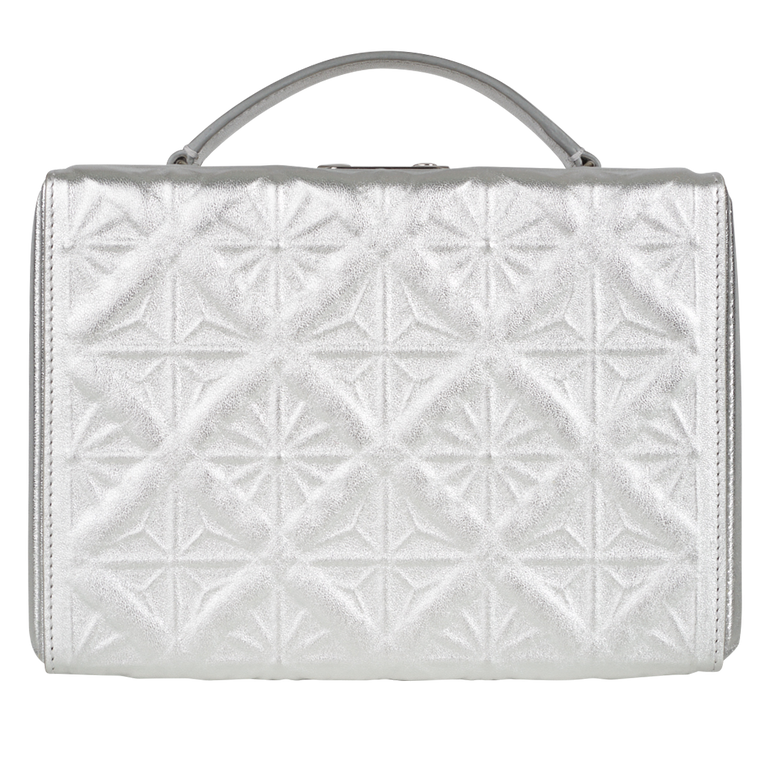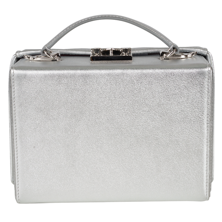 Top-handle bag, structured silhouette, adjustable and detachable crossbody strap, signature Grace lock with key, detachable key hood, internal zip pocket, protective metal feet.