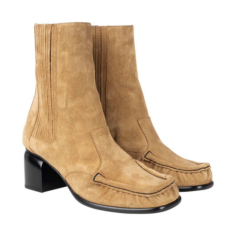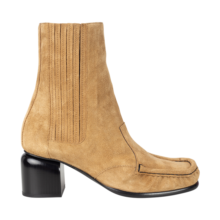 Ankle boot with handstitched contrast topstitching and 7 CM stacked heel.