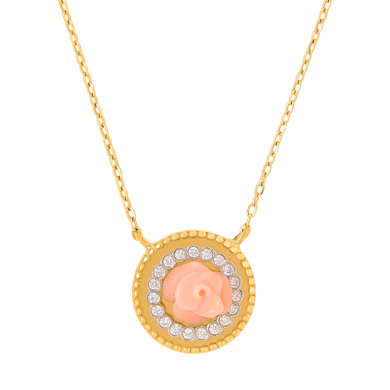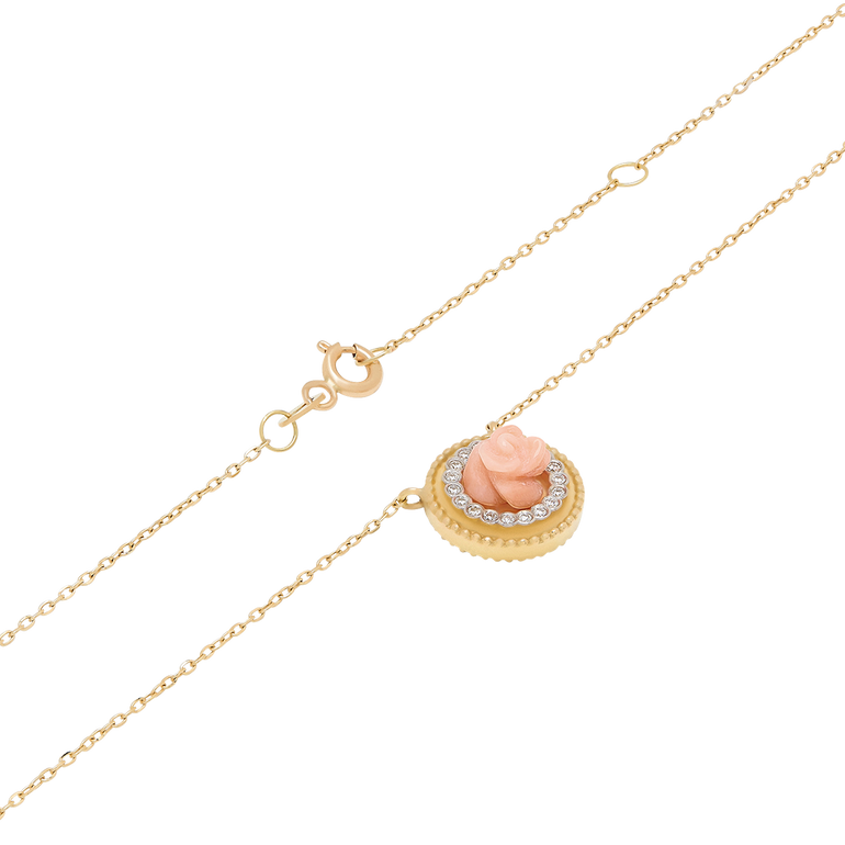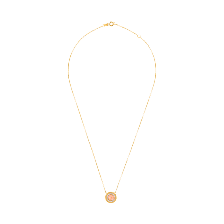 Pendant necklace with 5MM pink coral center stone and 0.1 CT. T.W. diamond. Item is reversible.