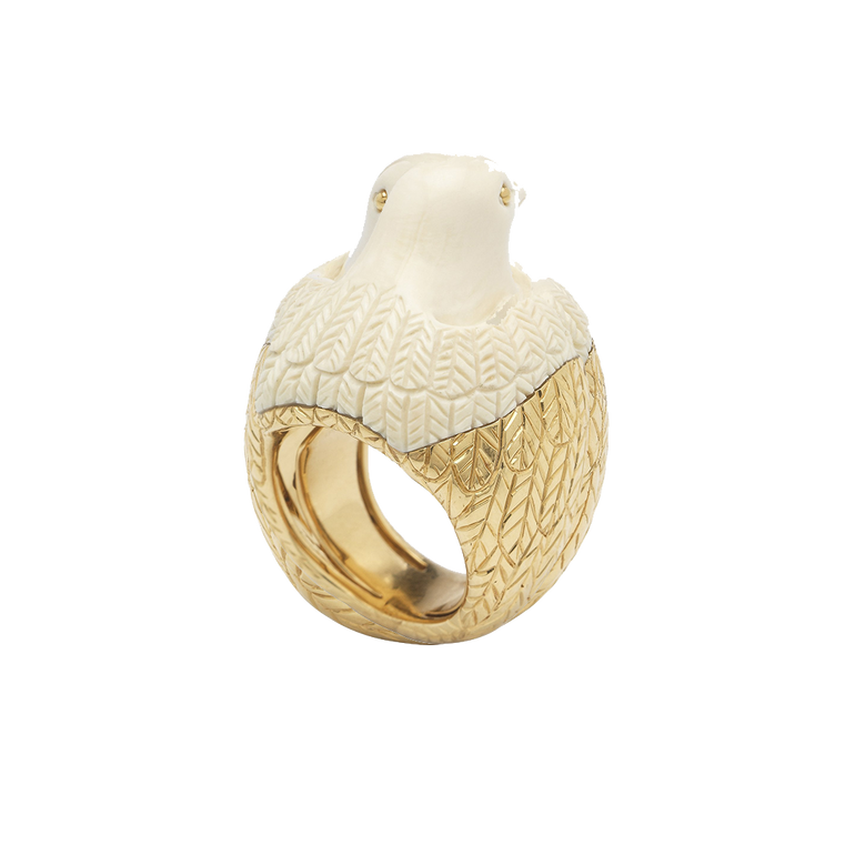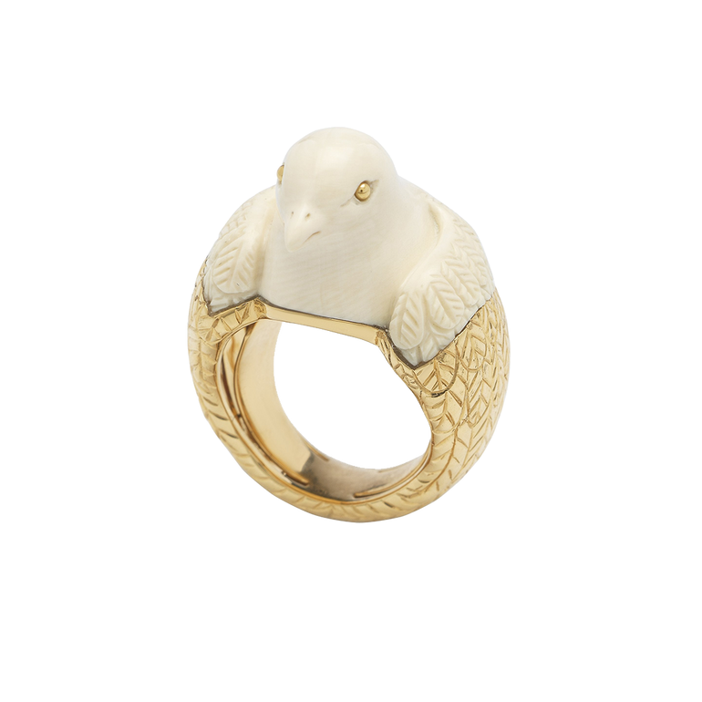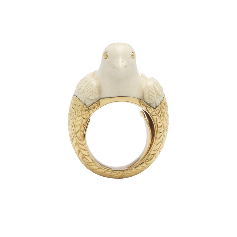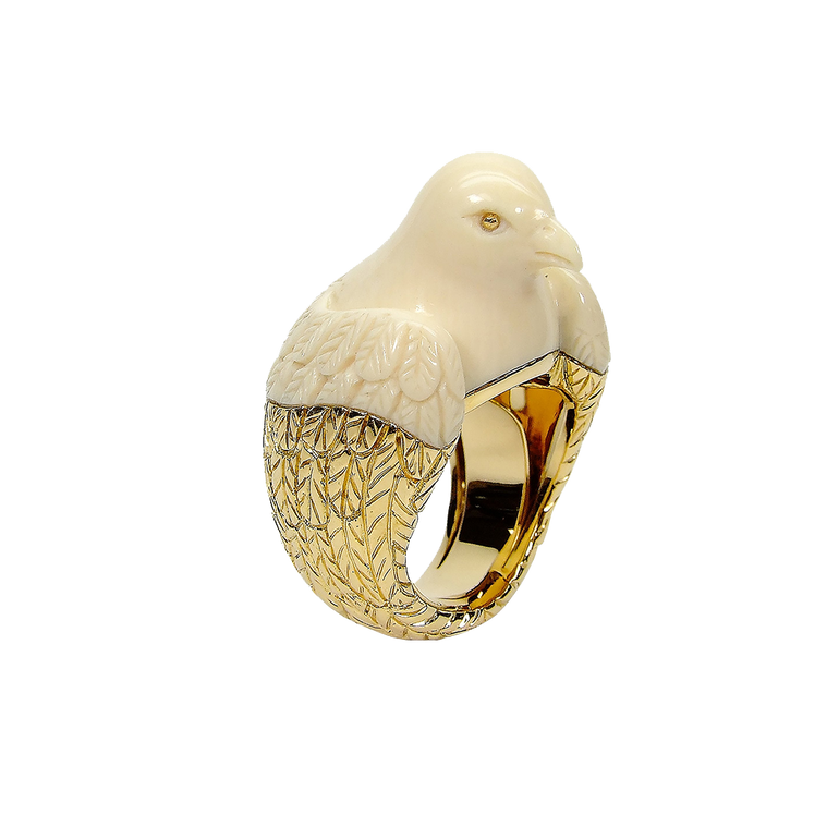 Ring, designed in 18k yellow gold, with feather details carved into its shank in 60,000-year-old mammoth tusk, and twinkling gold eyes.