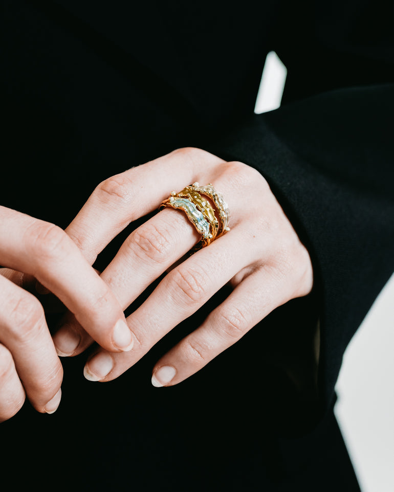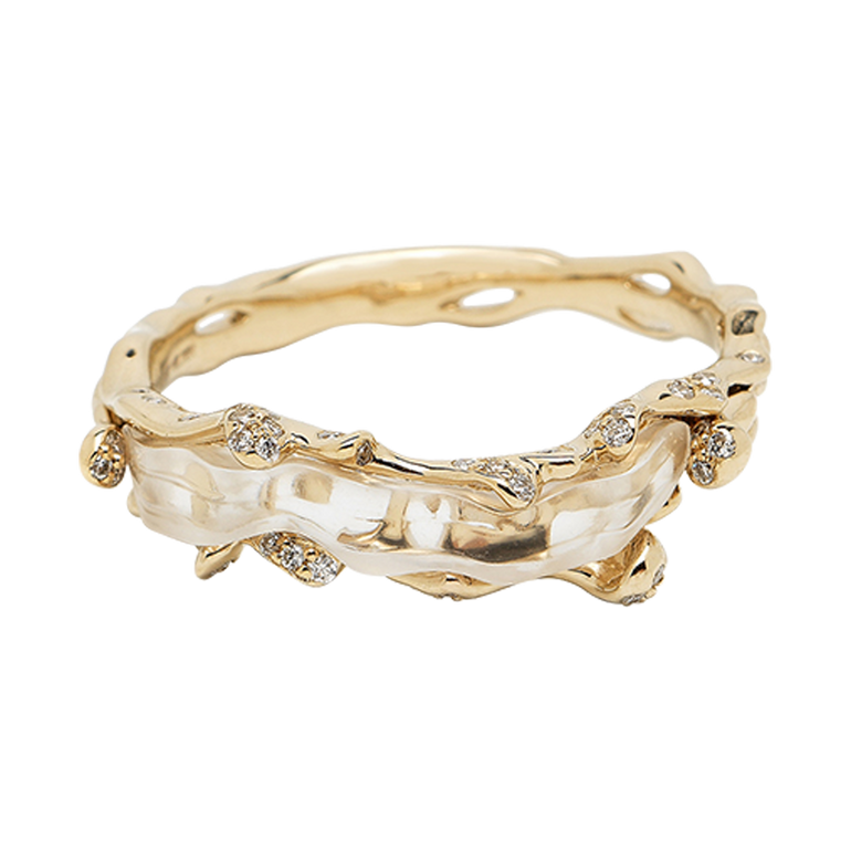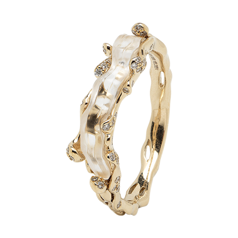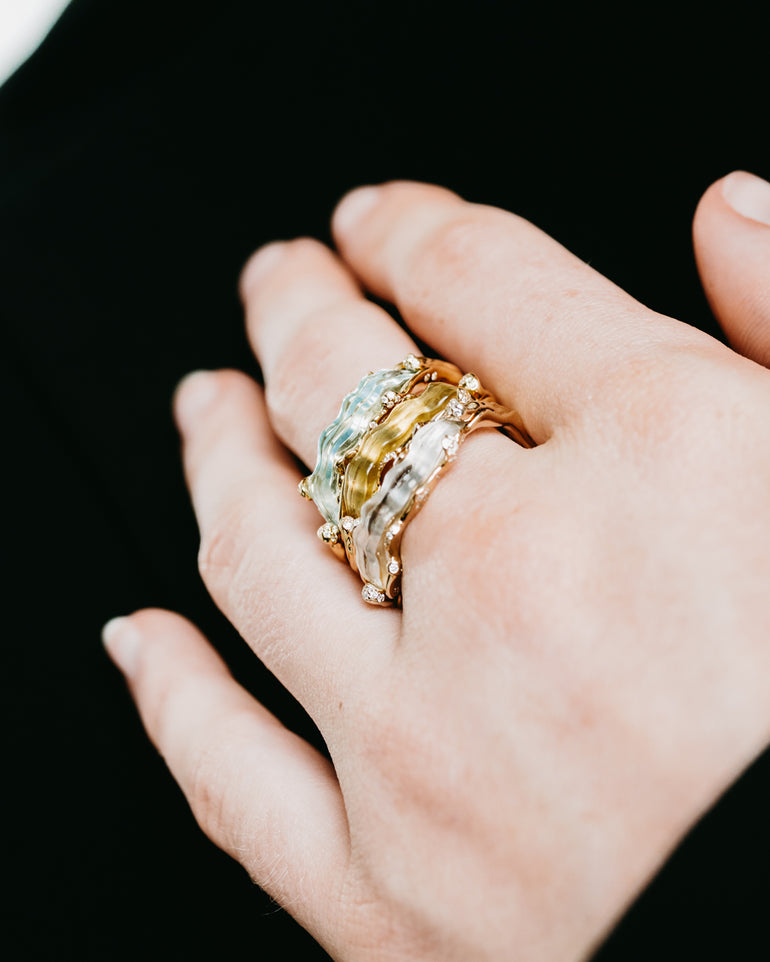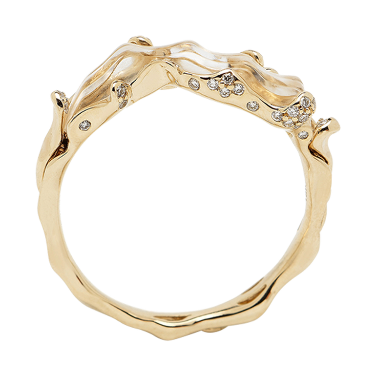 Stackable ring designed in white gold and crystal quartz with diamond accents to evoke the textured rise and fall of an ocean wave.