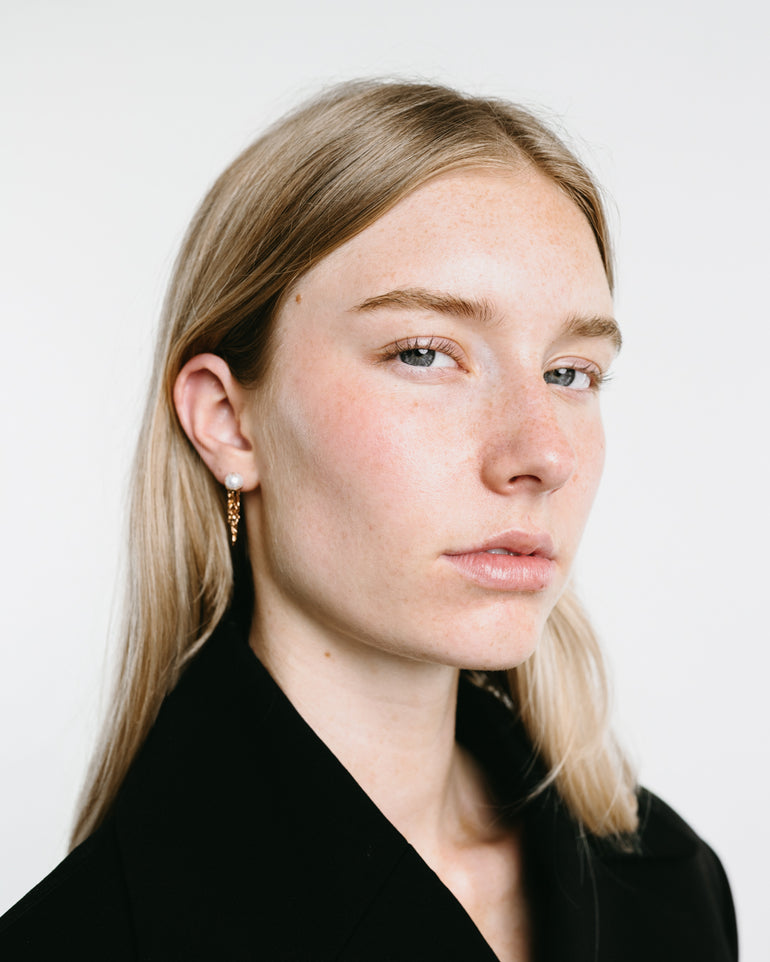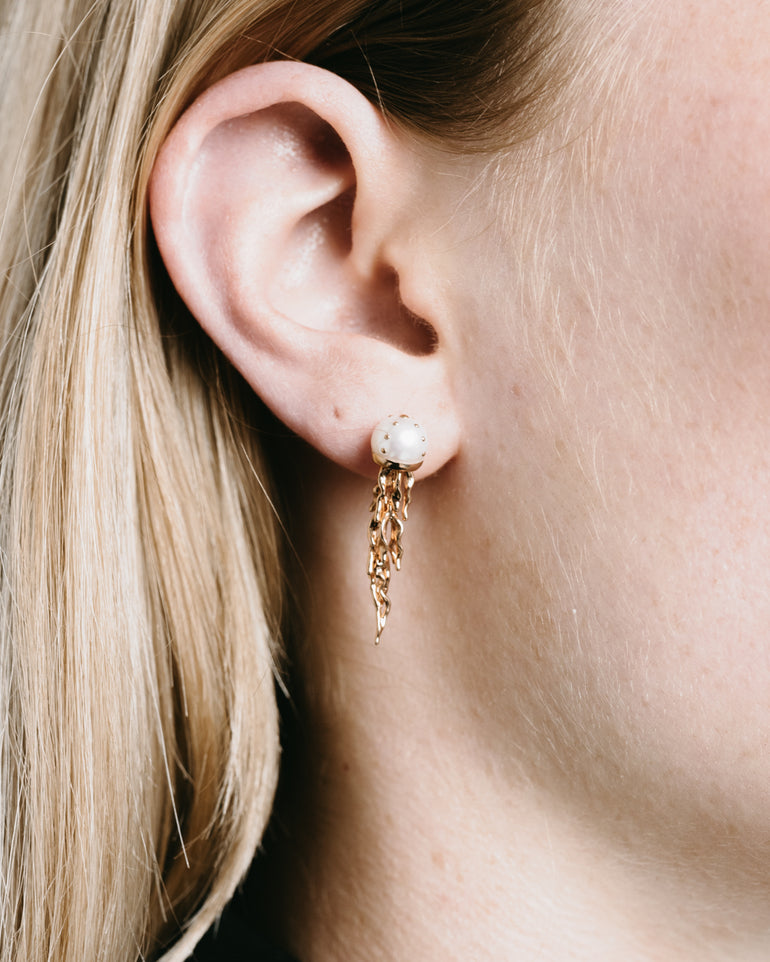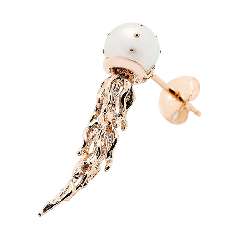 Single stud earring in jellyfish design with white pearl set as the jellyfish's bell and rose-gold tentacles extending below. For pierced ears.