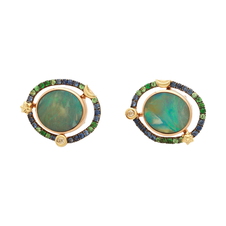 Two deliberately mismatching opals , with the opals' swirling surfaces resembling a galaxy's depths. Designed in 18K rose gold, the earrings are encircled by rings embellished with blue sapphires and green Tsavorites.