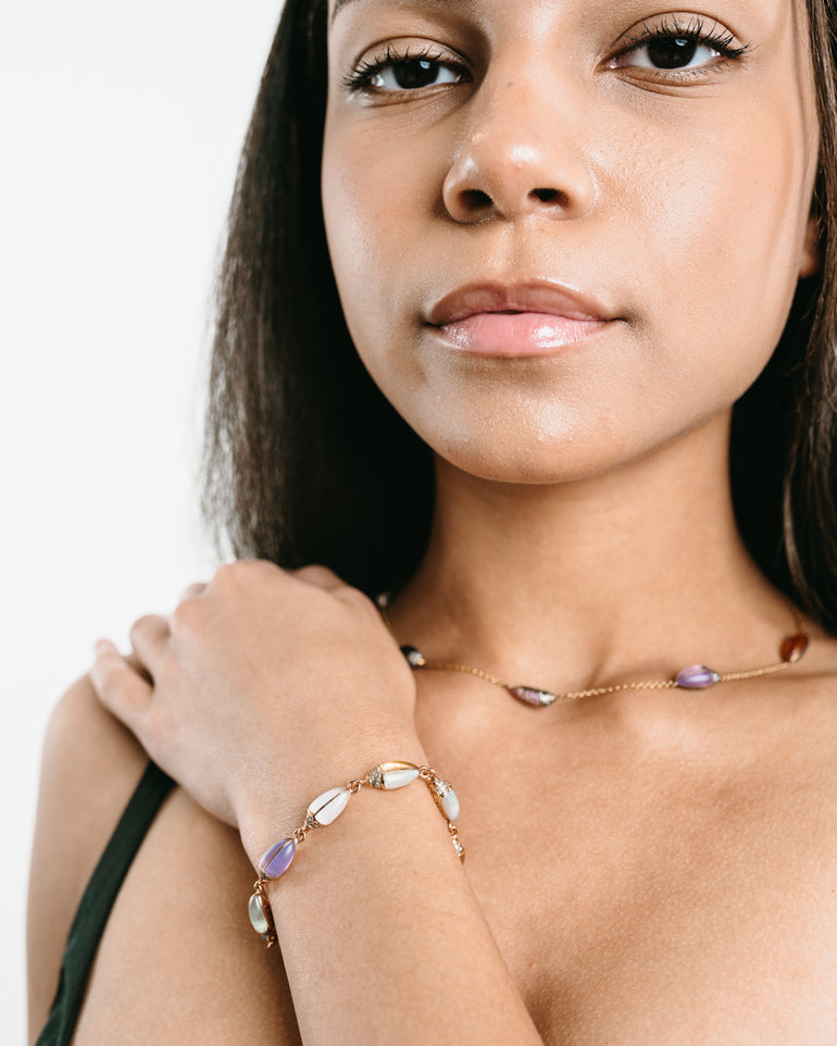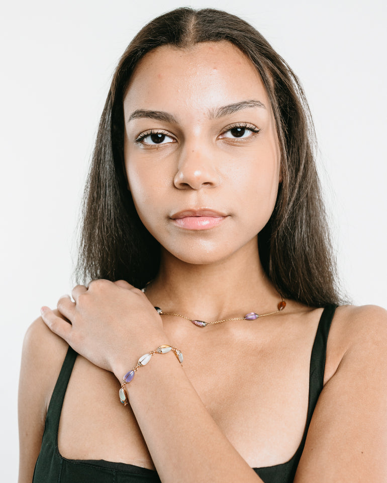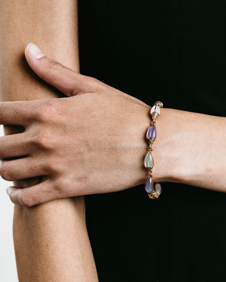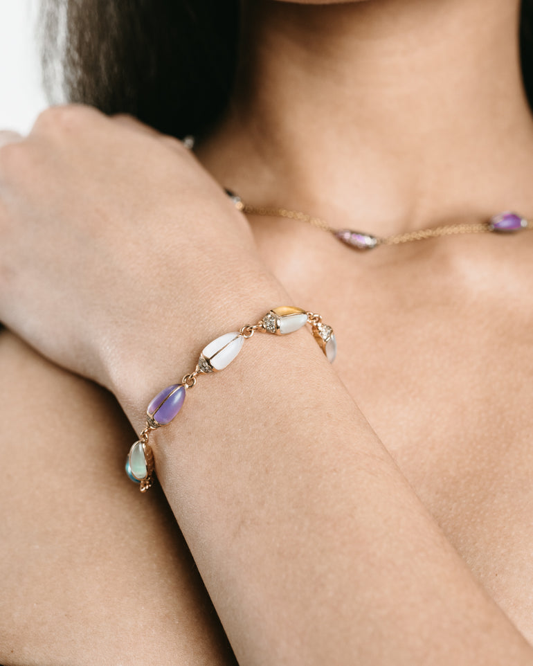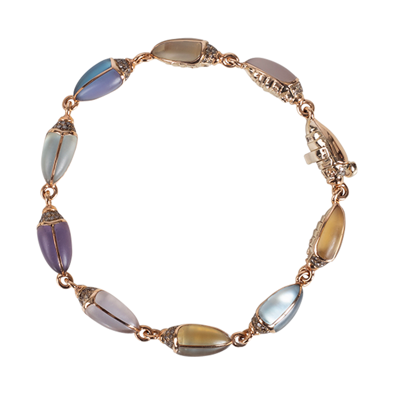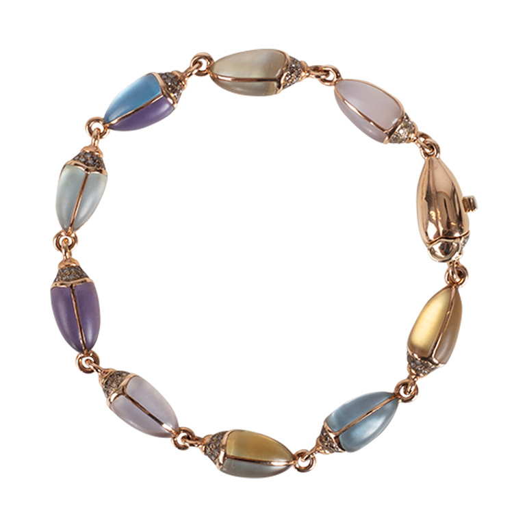 Bracelet featuring mini scarabs in various gemstones and finished with a secure 18K gold clasp.