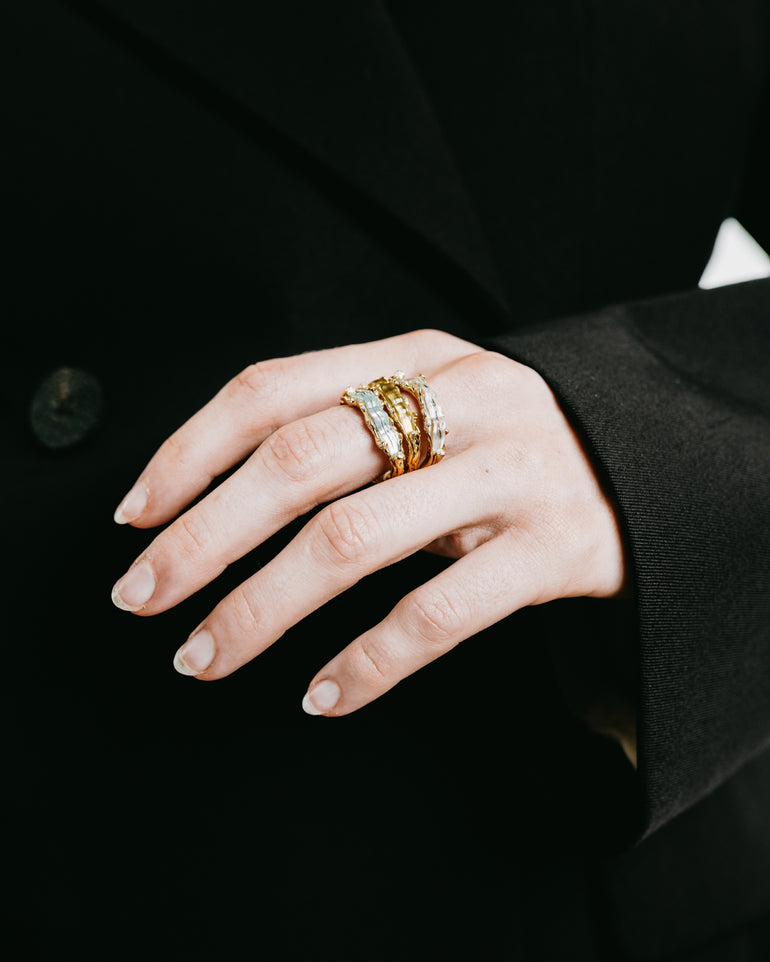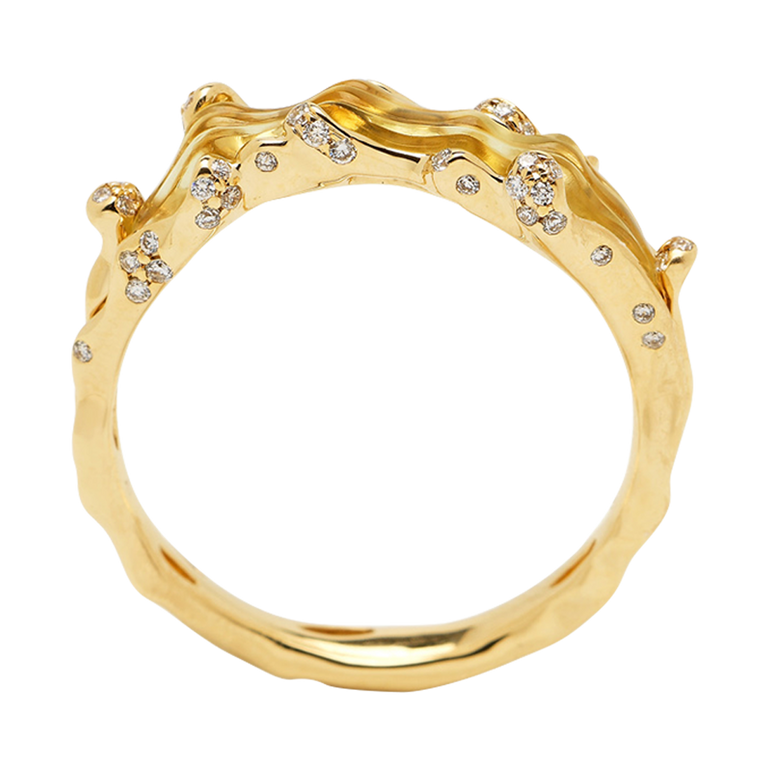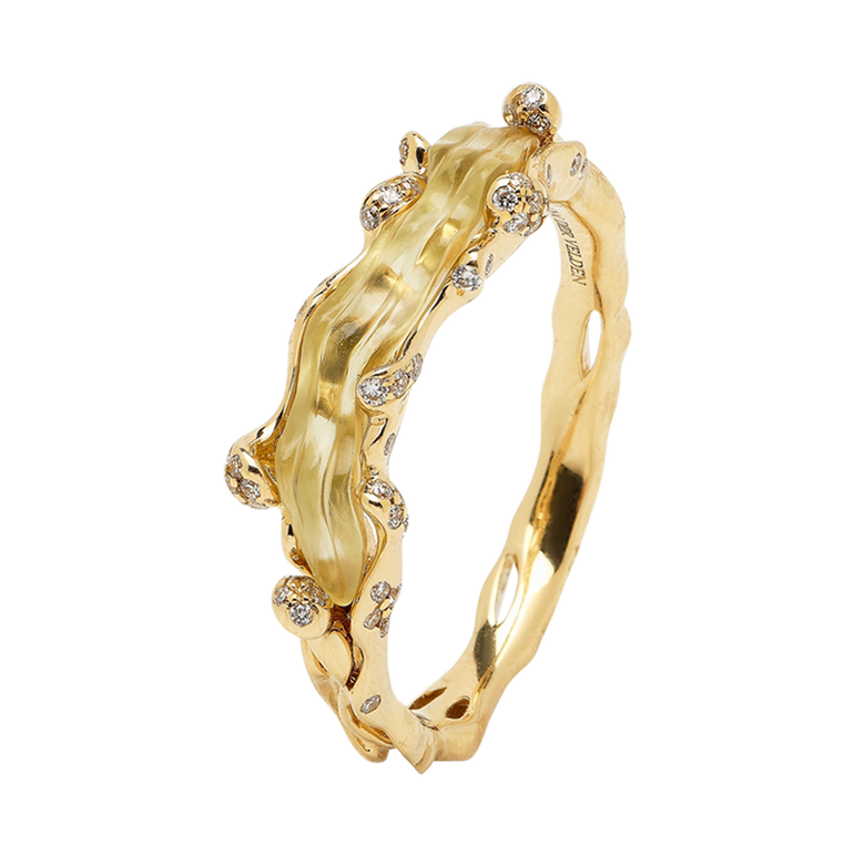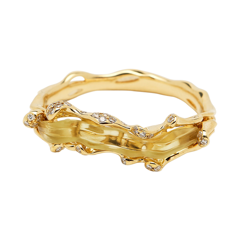 Stackable ring designed in yellow gold and warm olive quartz with diamond accents to evoke the textured rise and fall of an ocean wave.
