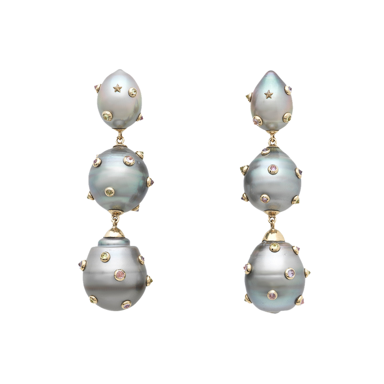 Trio Spike Earrings are designed as three Tahitian pearls that hang below one another. Pearls are embellished with pink sapphires, amethysts, and Tsavorites with 18K white gold chain attaches pearls to each other.
