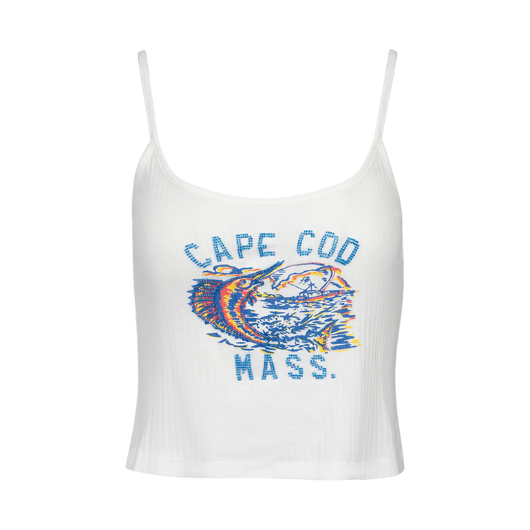 Tank top with 1980s Cape Cod-inspired beaded sailfish print.