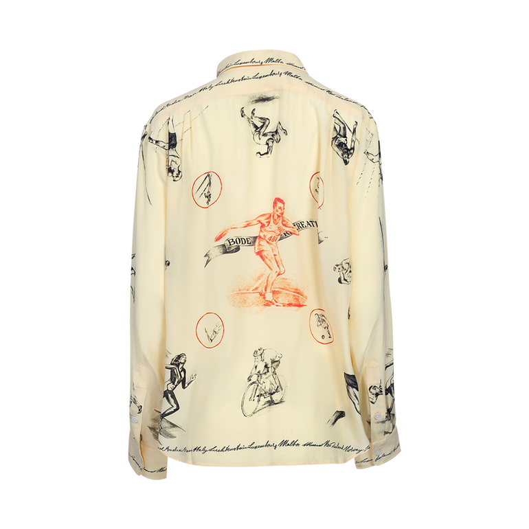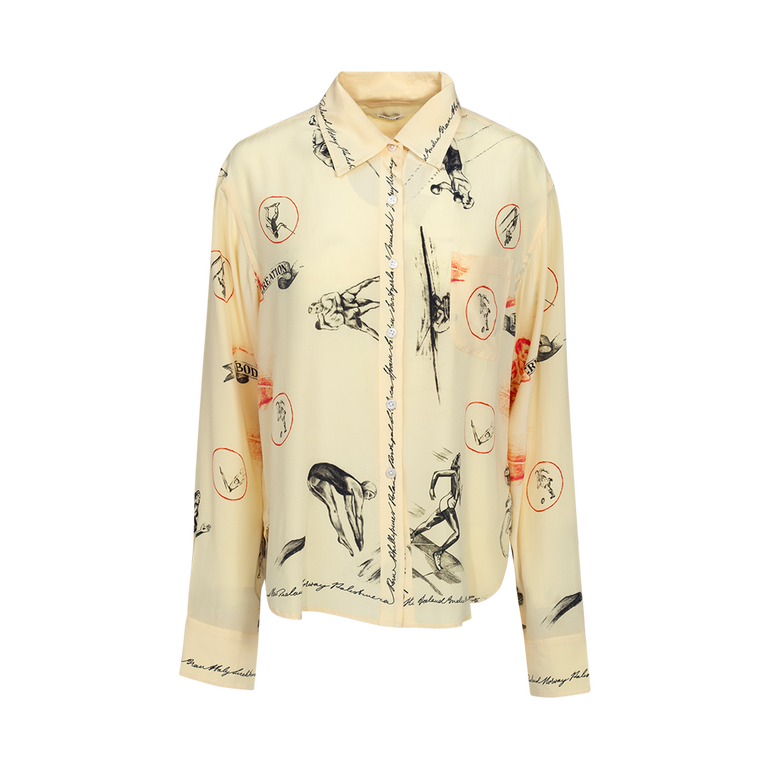 Long-sleeved shirt with button front and print inspired by a 1948 souvenir scarf.