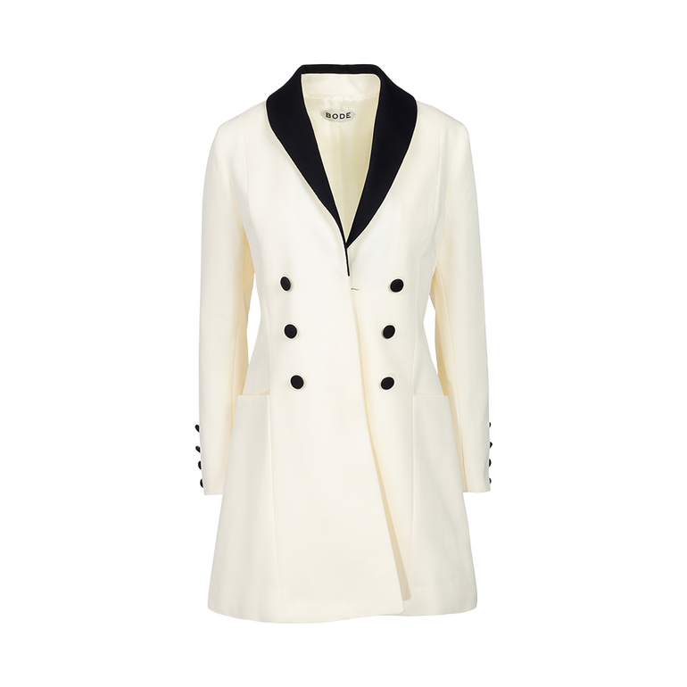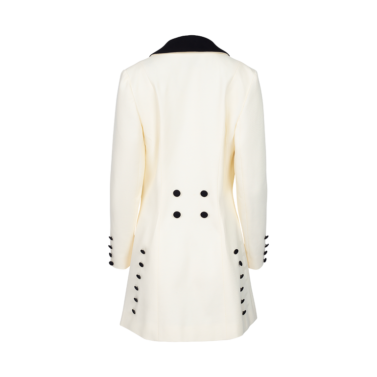 Tailored minidress inspired by men's suiting from the early 20th century with contrasting shawl lapel and decorative buttons mimicking a double-breasted front.