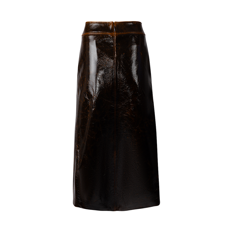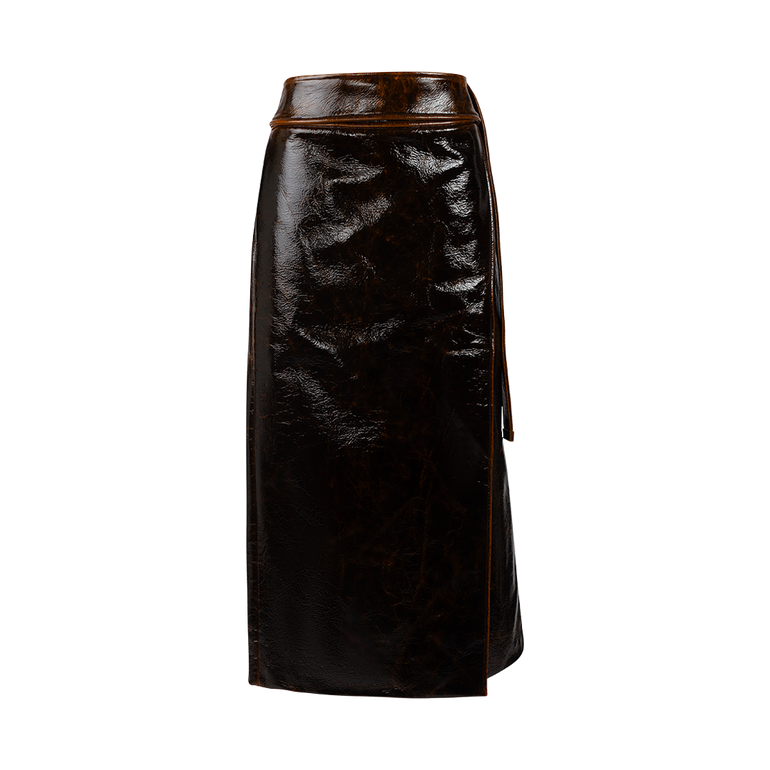 Structured wrap skirt with belt tip logo hardware, high rise, below-the-knee hem and concealed back zip. Lined.