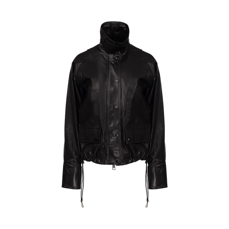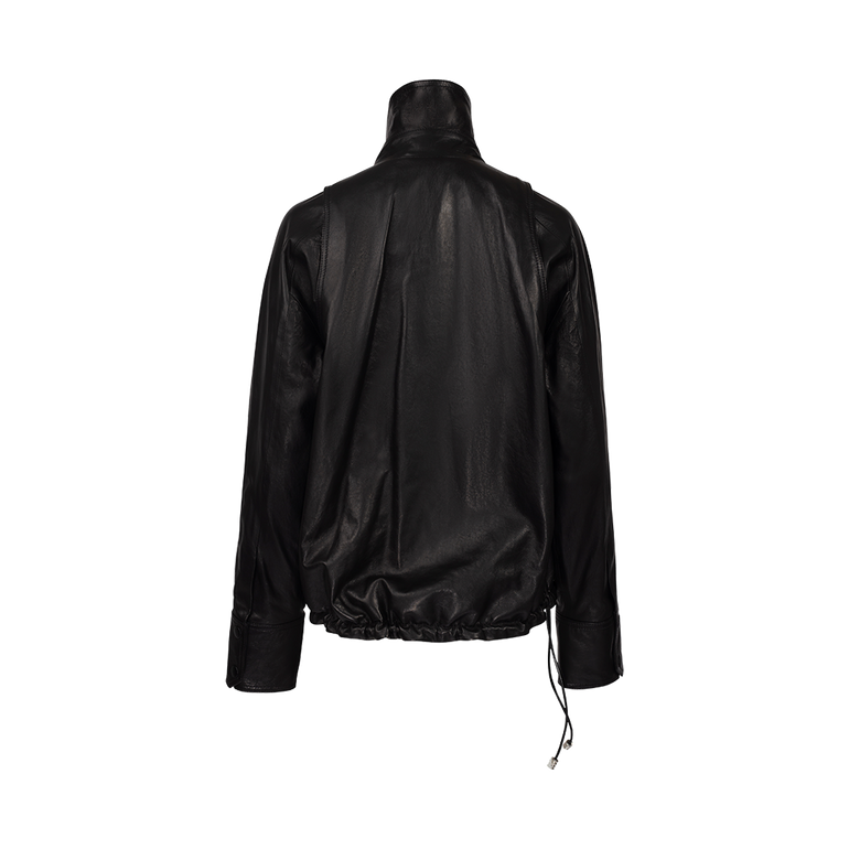 Leather jacket with sculptural funnel collar, adjustable balloon waistband and concealed zip and button closure.