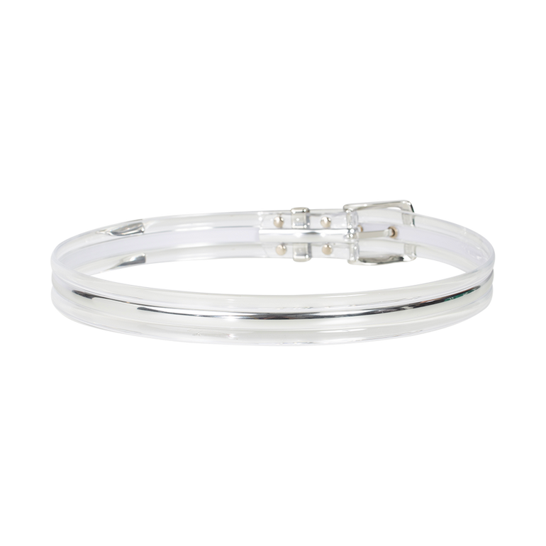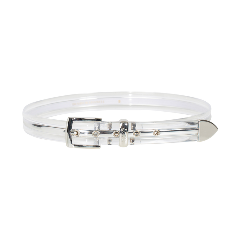 Transparent belt with metallic interior, pin-buckle closure, and adjustable fit. We recommend sizing down if you plan to wear it only at the waist.