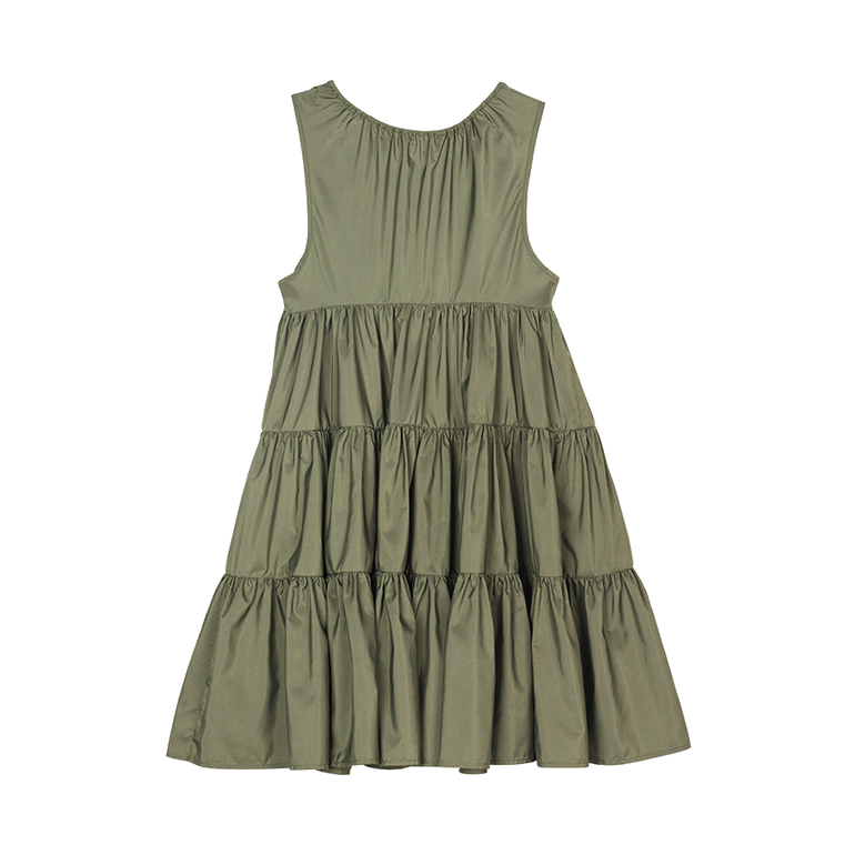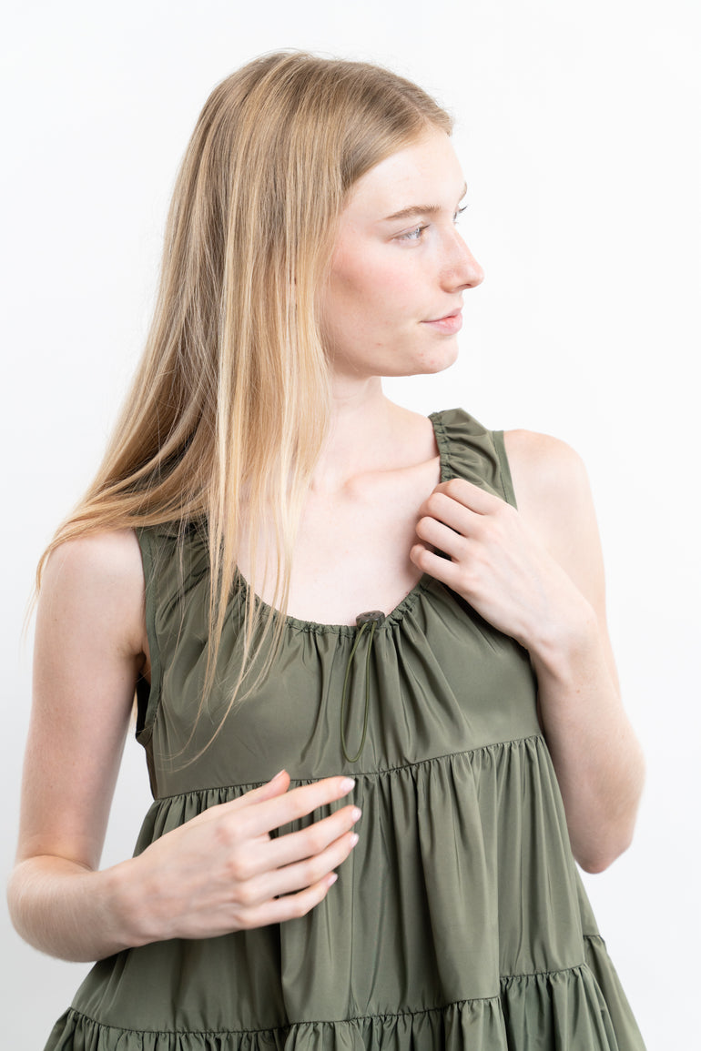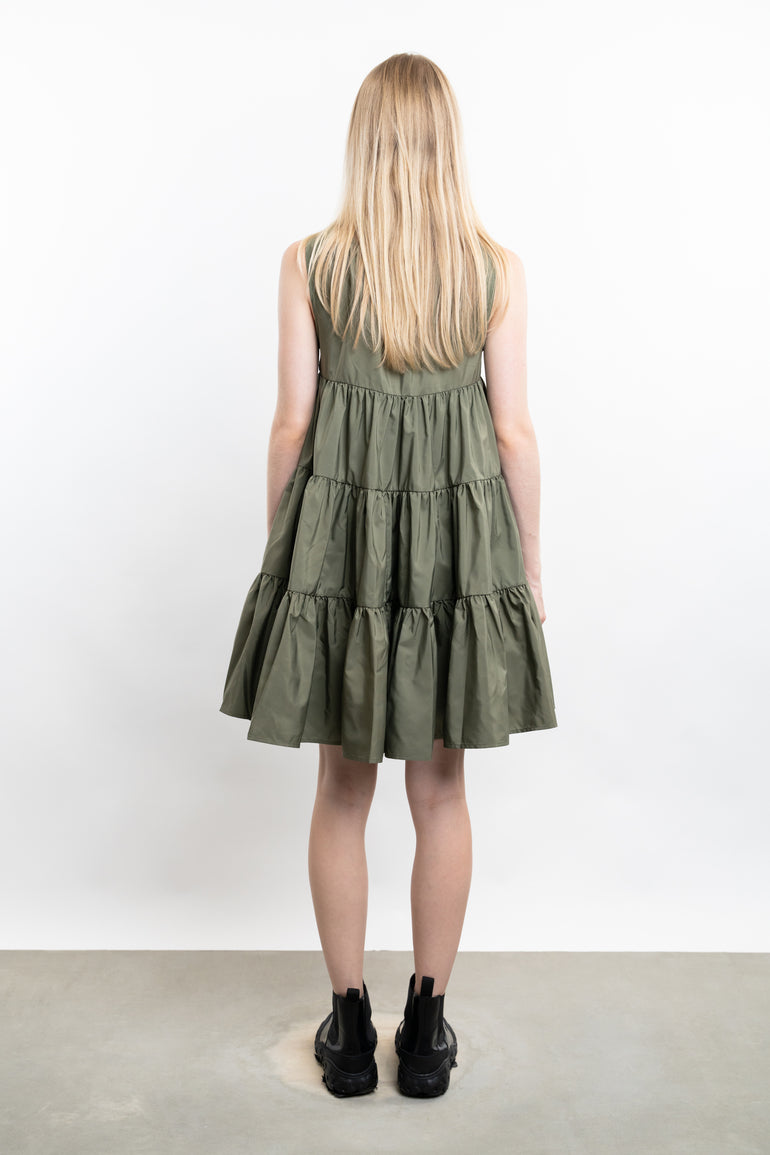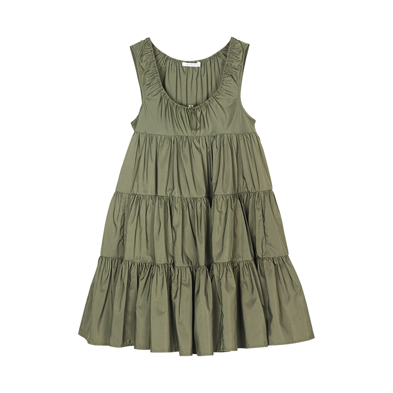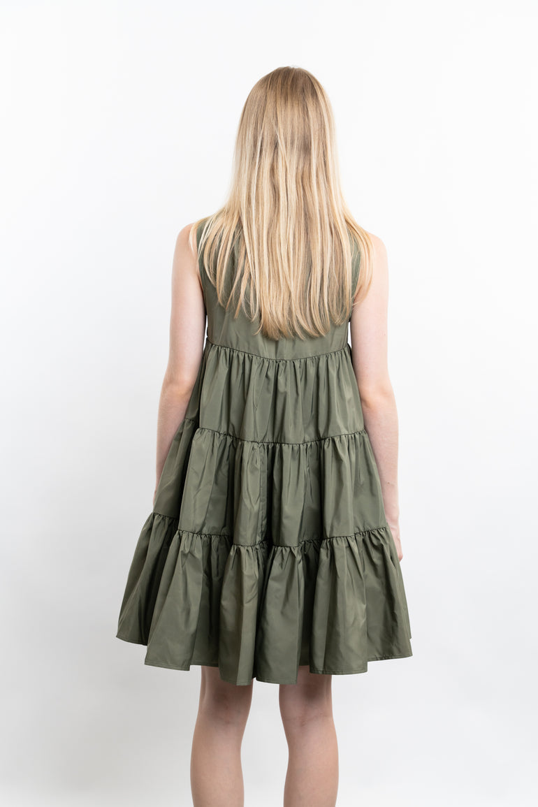 Sleeveless minidress with scoop neckline, empire waist and tiered ruffle skirt.