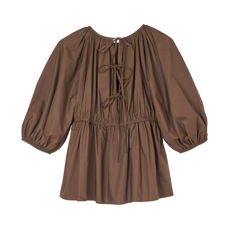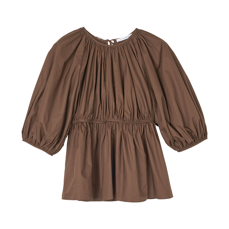 Top in peplum silhouette with elbow-length puffed sleeves and soft waist gathering.