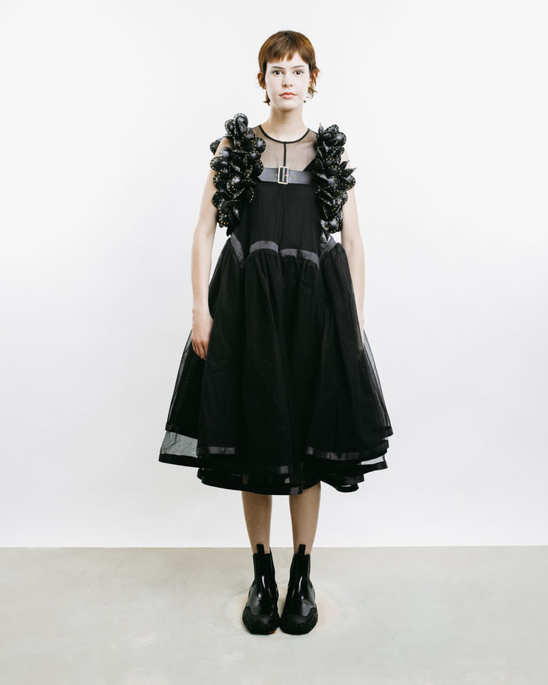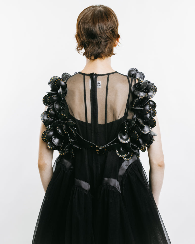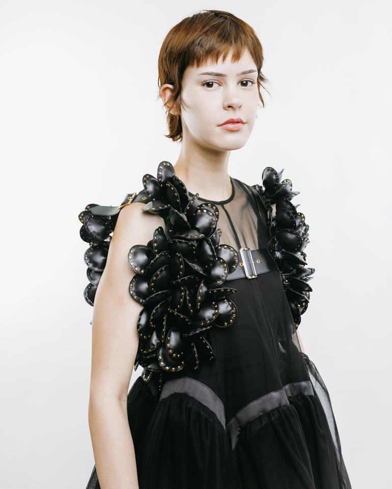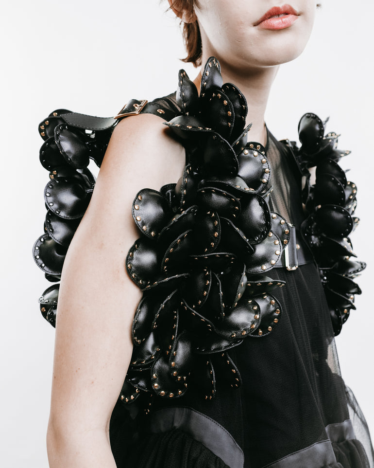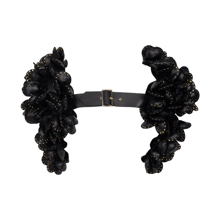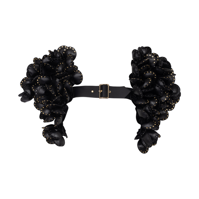 Harness featuring floral appliqués and adjustable shoulder straps.