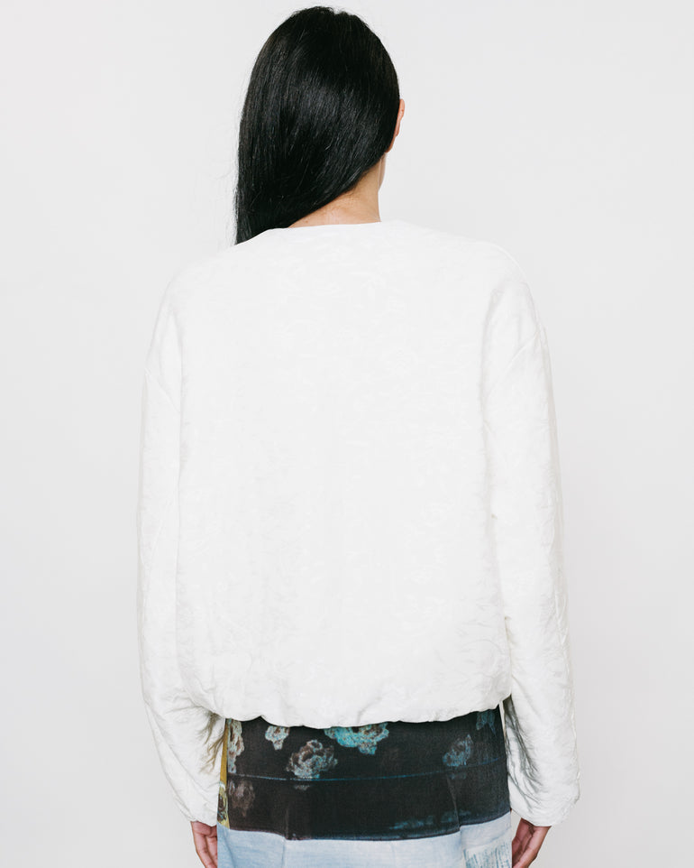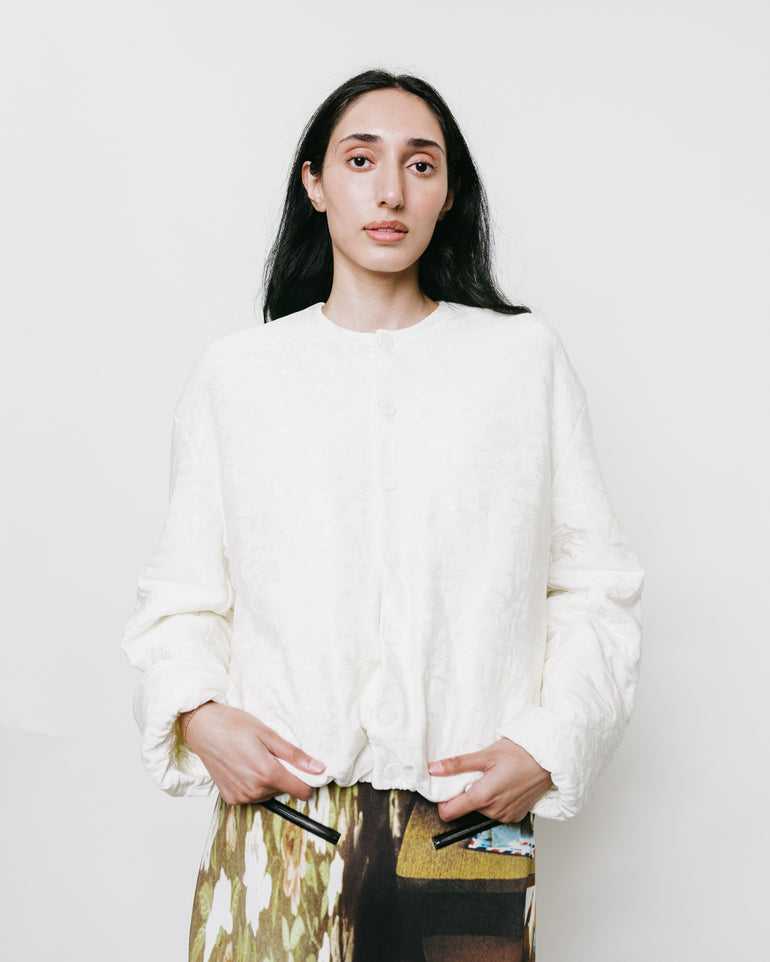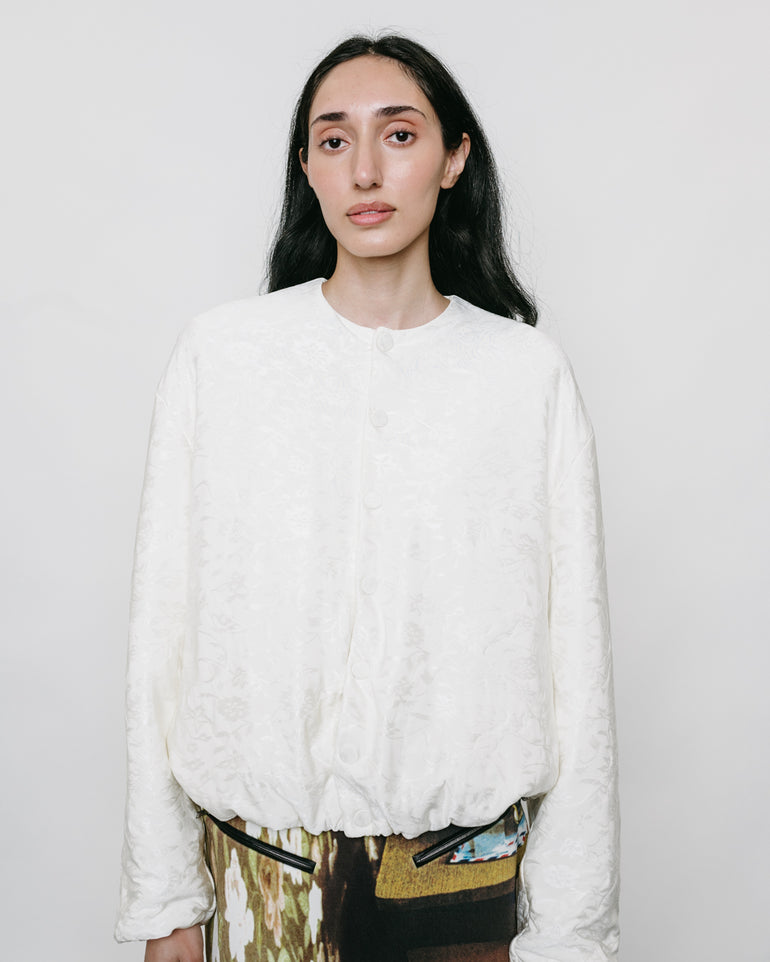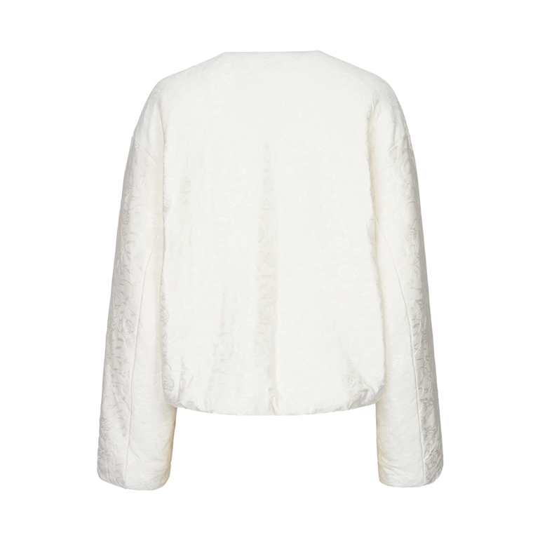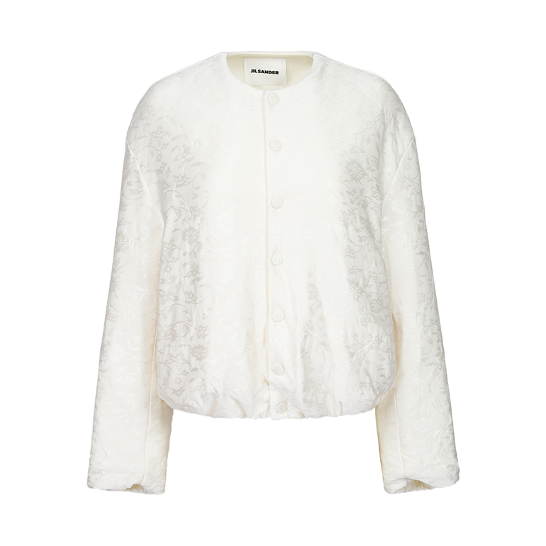 Bomber jacket in allover jacquard floral pattern with round neckline, press-stud closure, seam pockets and dropped shoulders.