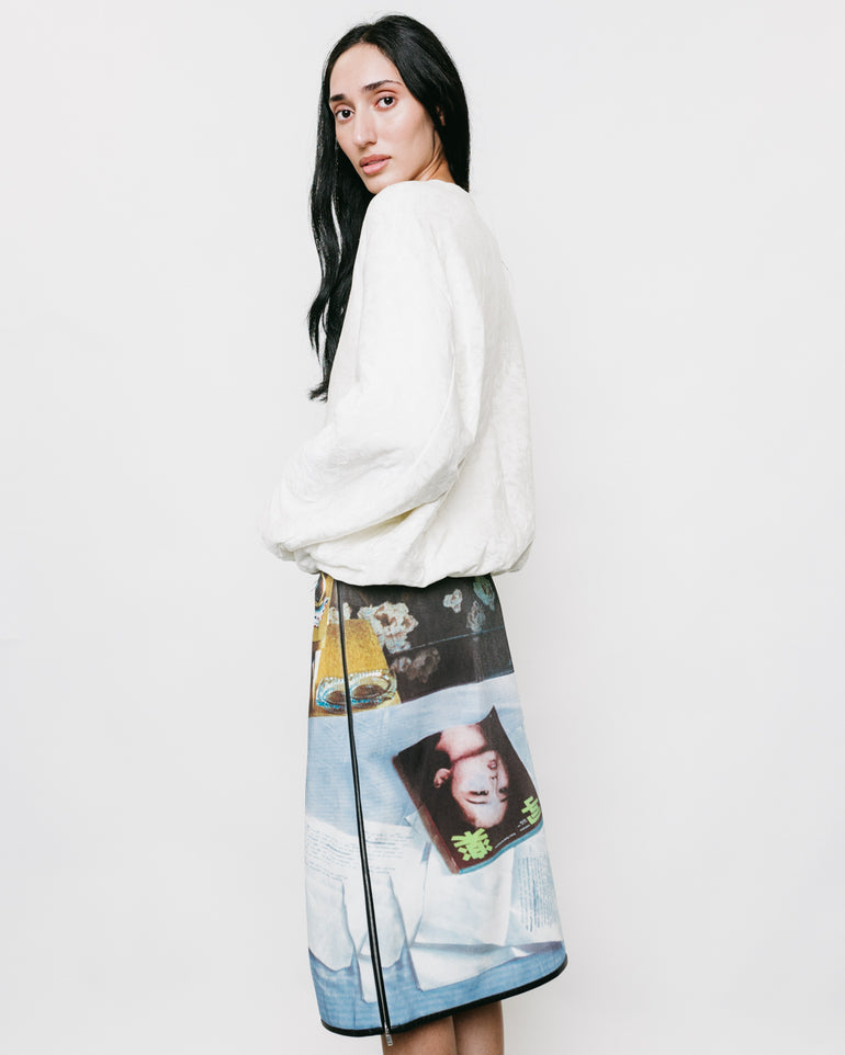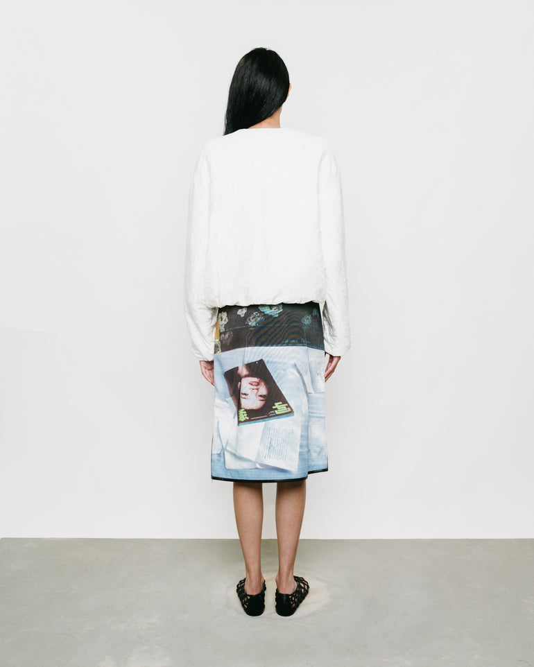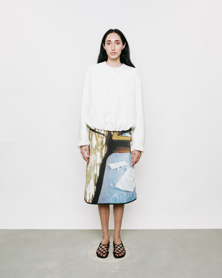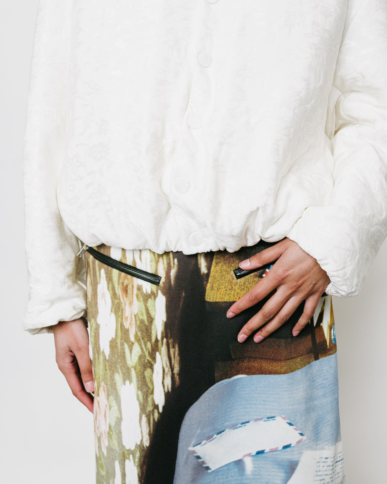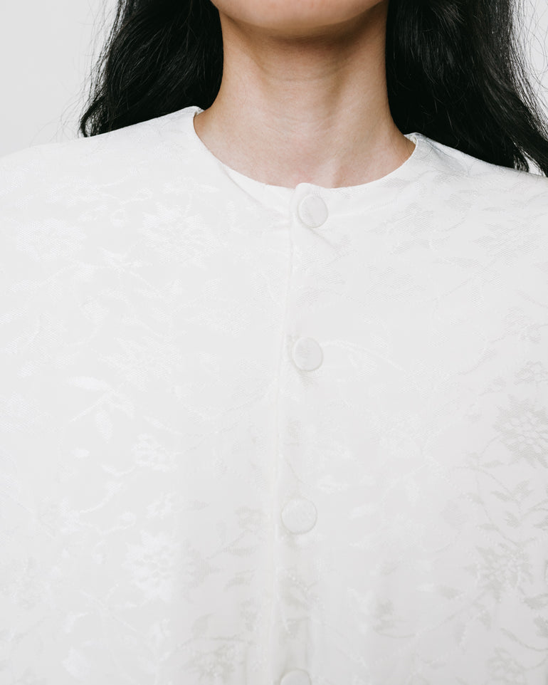 Bomber jacket in allover jacquard floral pattern with round neckline, press-stud closure, seam pockets and dropped shoulders.