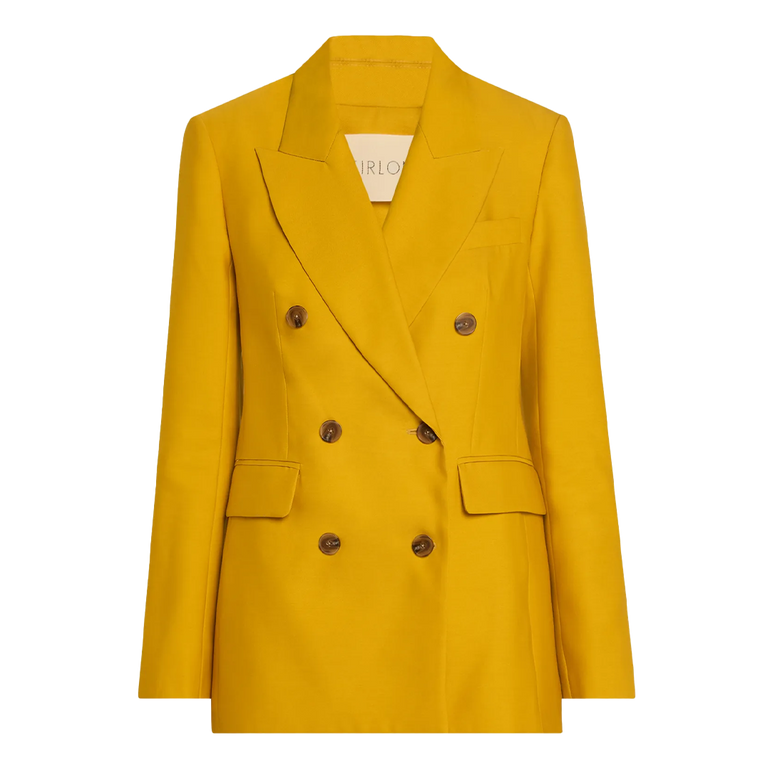 Blazer with peak lapels, double-breasted front, long sleeves, button cuffs and padded shoulders.