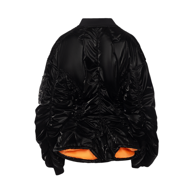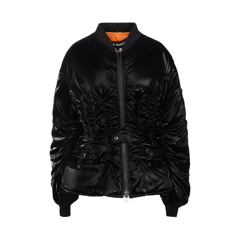 Bomber jacket with integrated corset structure for cinched waist effect, front zip and side pockets.