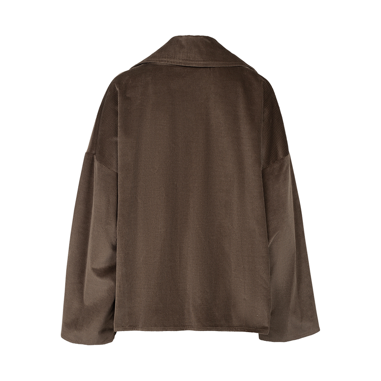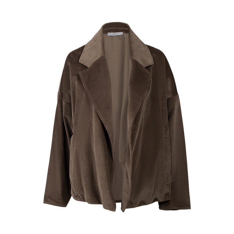 Oversized blazer with notched lapels, dropped shoulders, open front and angled slip pockets.