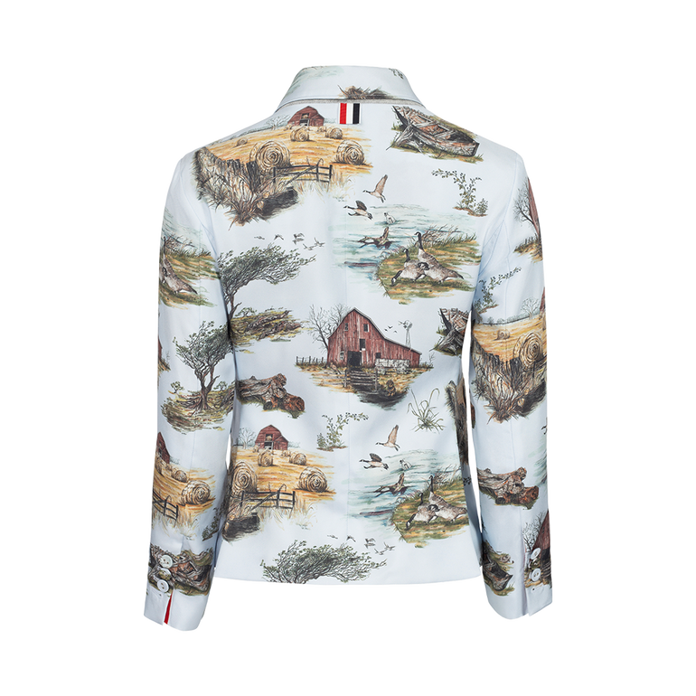 Jacket with button front, single chest pocket, two front flap pockets, and double vented back.