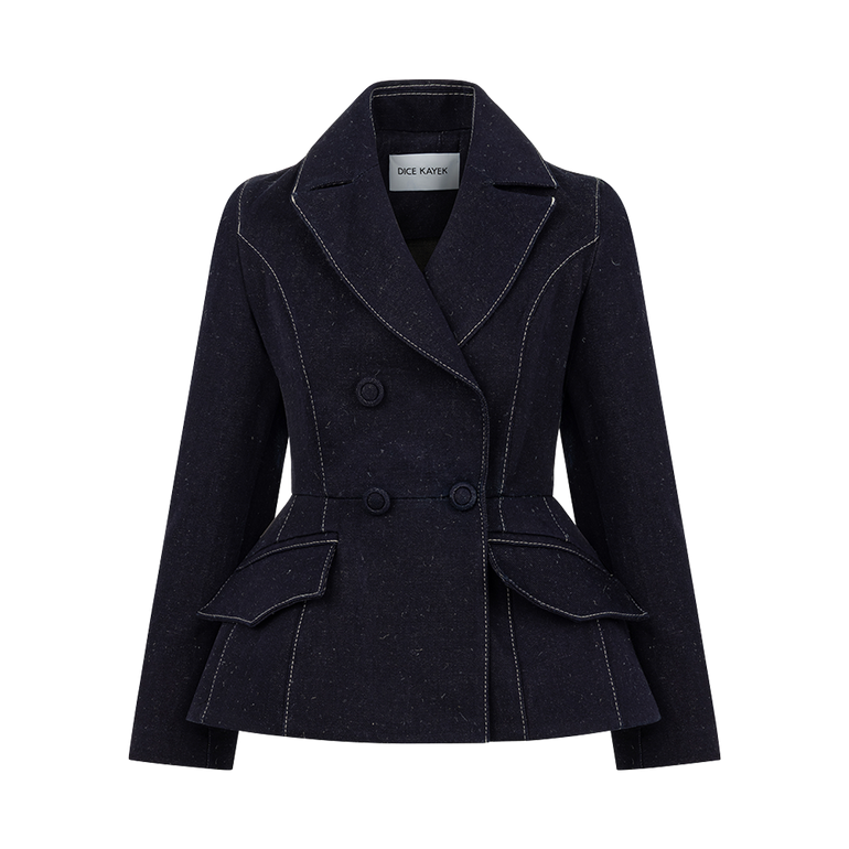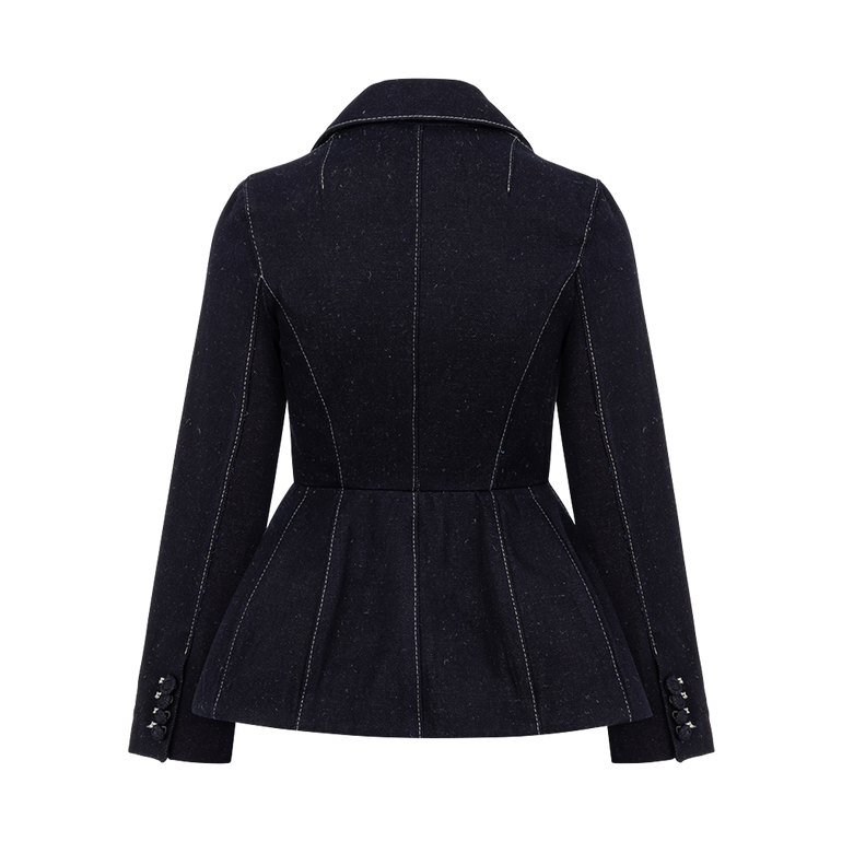 Structured long-sleeve jacket with rounded shoulders, button front, and classic collar.