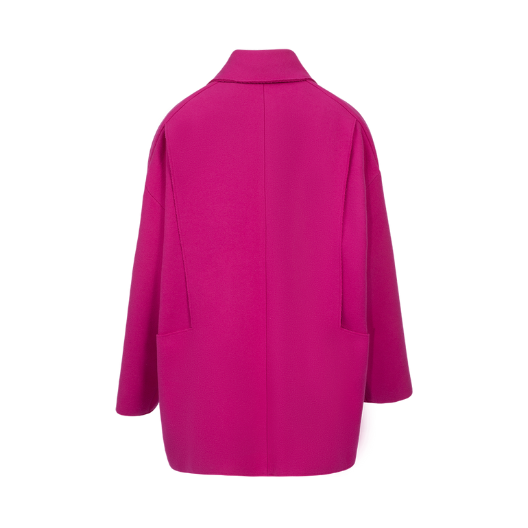 Oversized coat with wrap-style front and button closure.