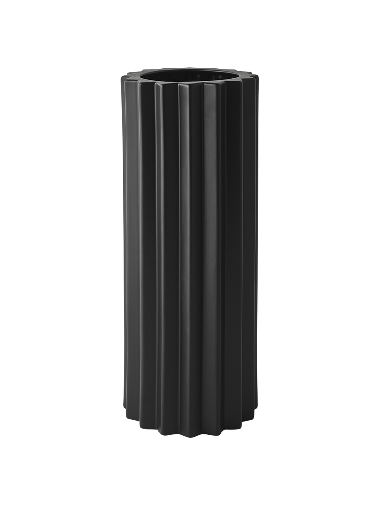Black cog shaped ceramic vase. 7.8 x H19.7″