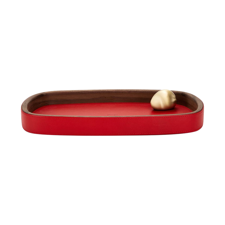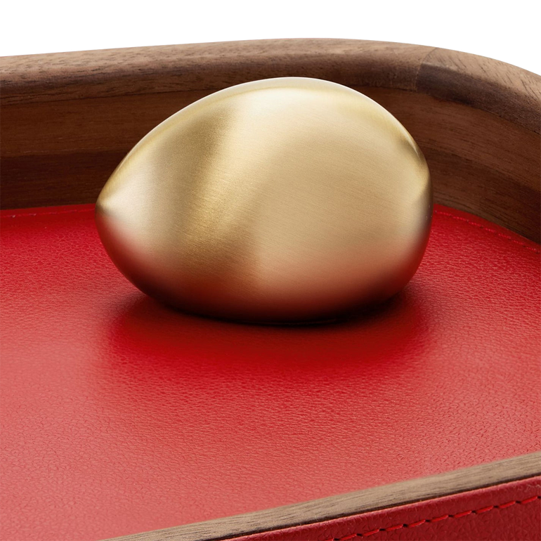 Made from red pebbled leather with walnut wood edges, the Pebble Accessory Tray features a unique brushed brass rock-shaped piece, magnetically attached. 8.8" 14" x 1.6"; 2.6 lbs.