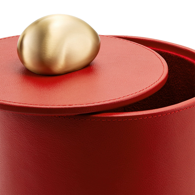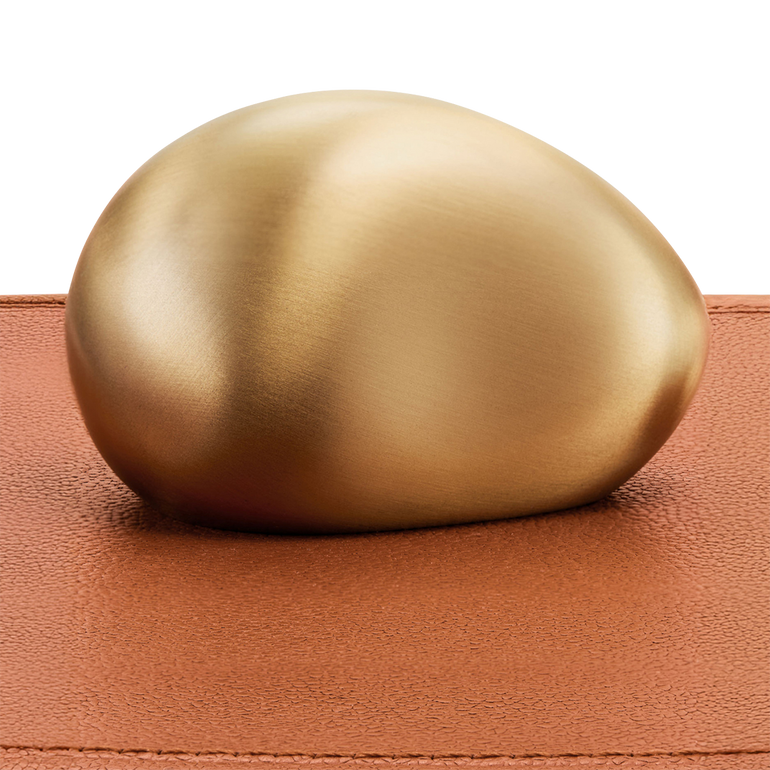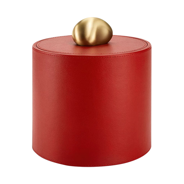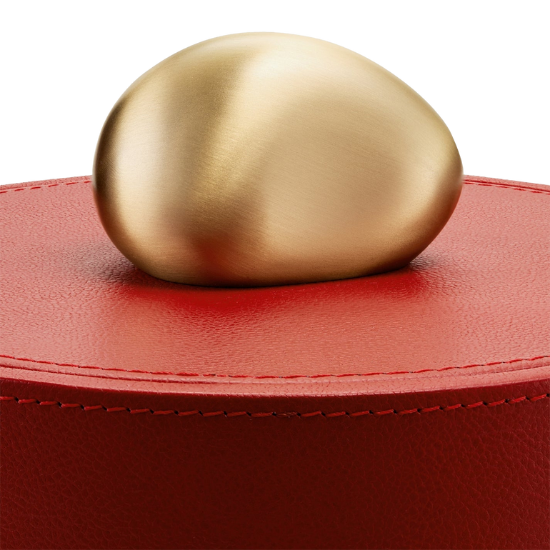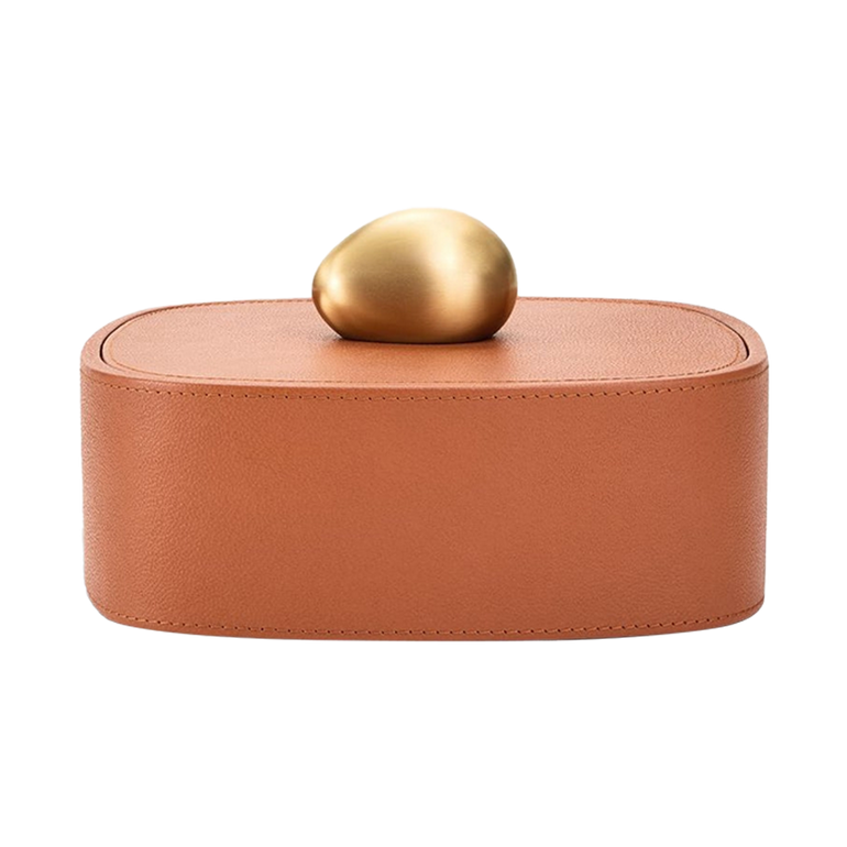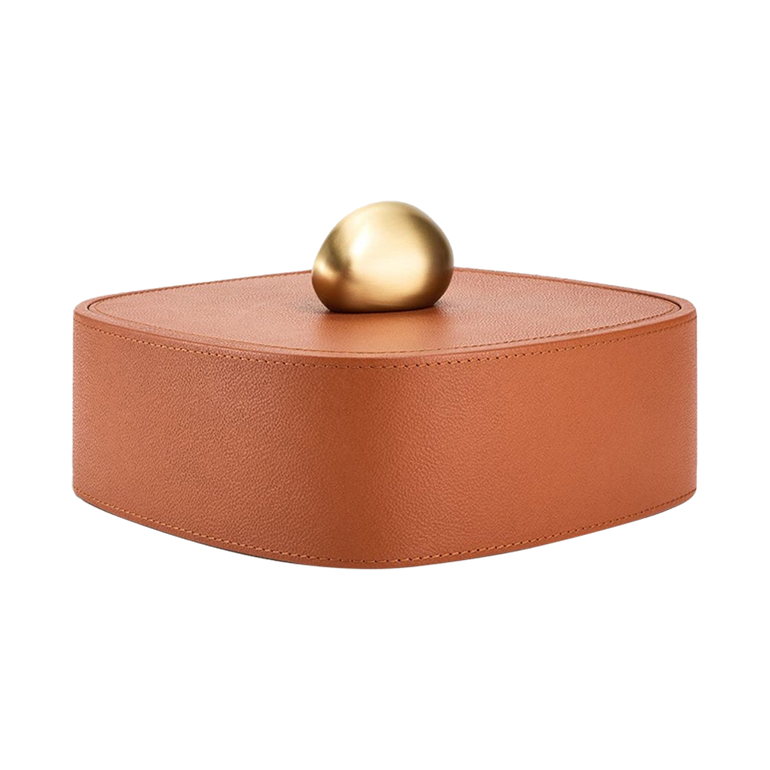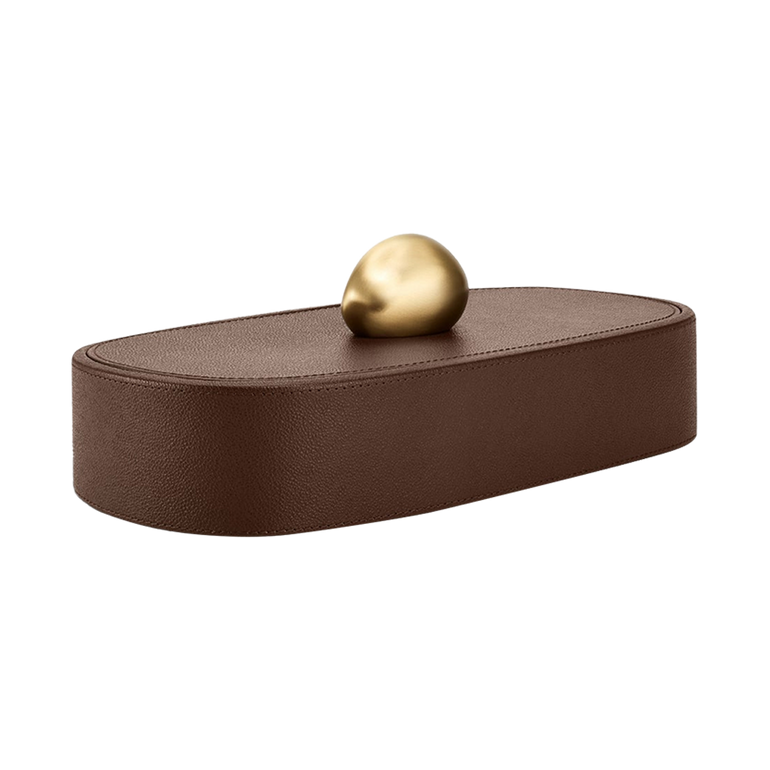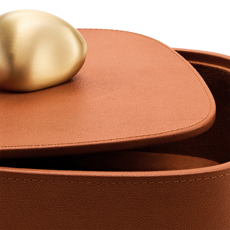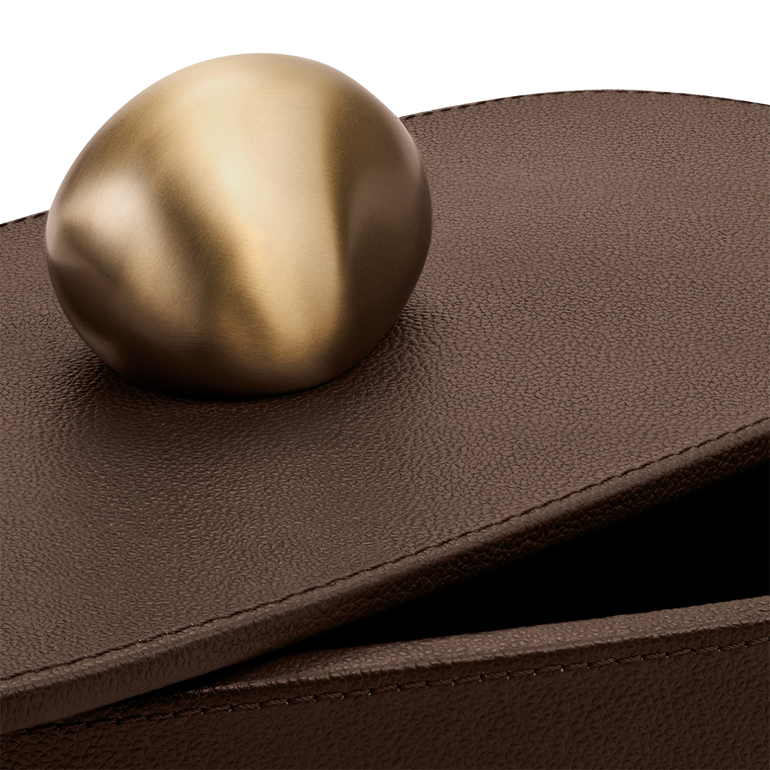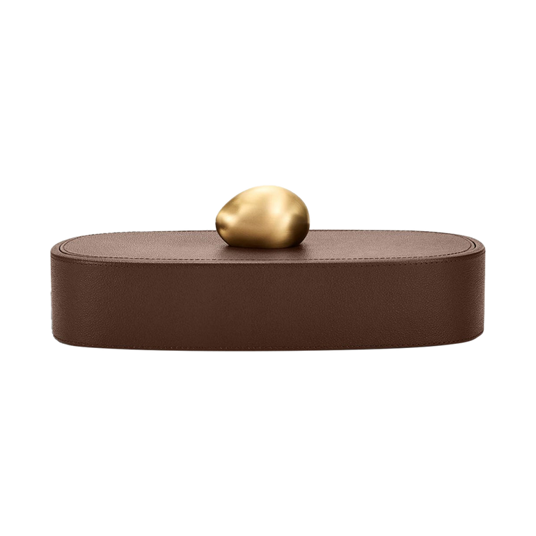 From a collection of three, this Pebble Box offers chic storage fashioned in pebbled leather and topped with a brushed brass, rock-shaped handle.