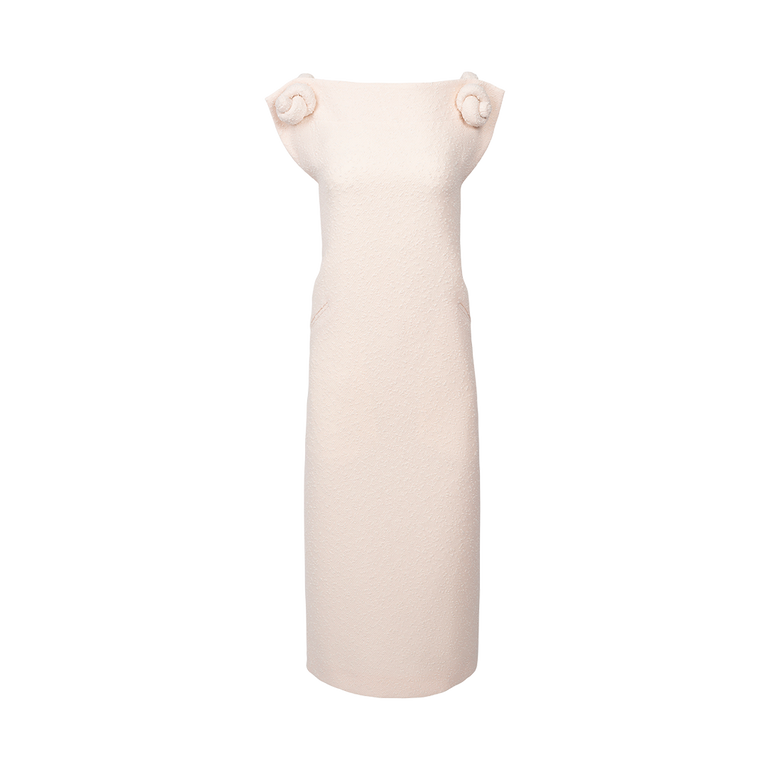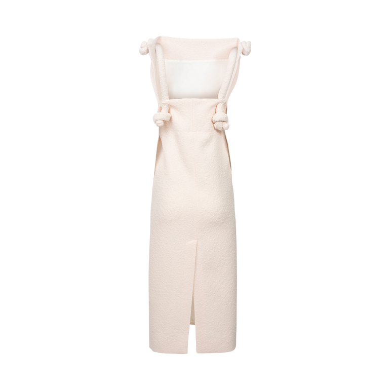 Midi dress with padded straps with knots, open back and split in the center back. Lined.