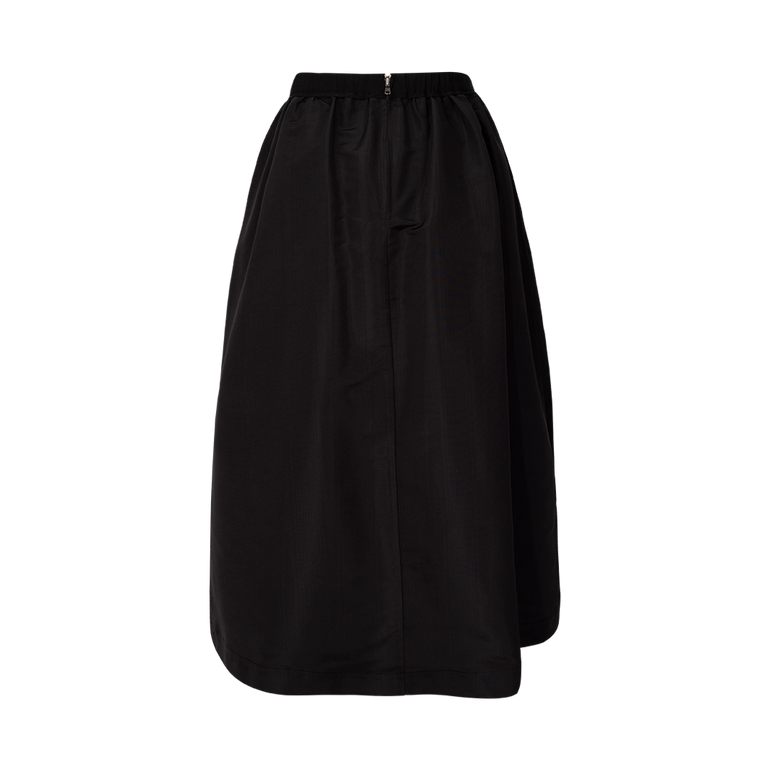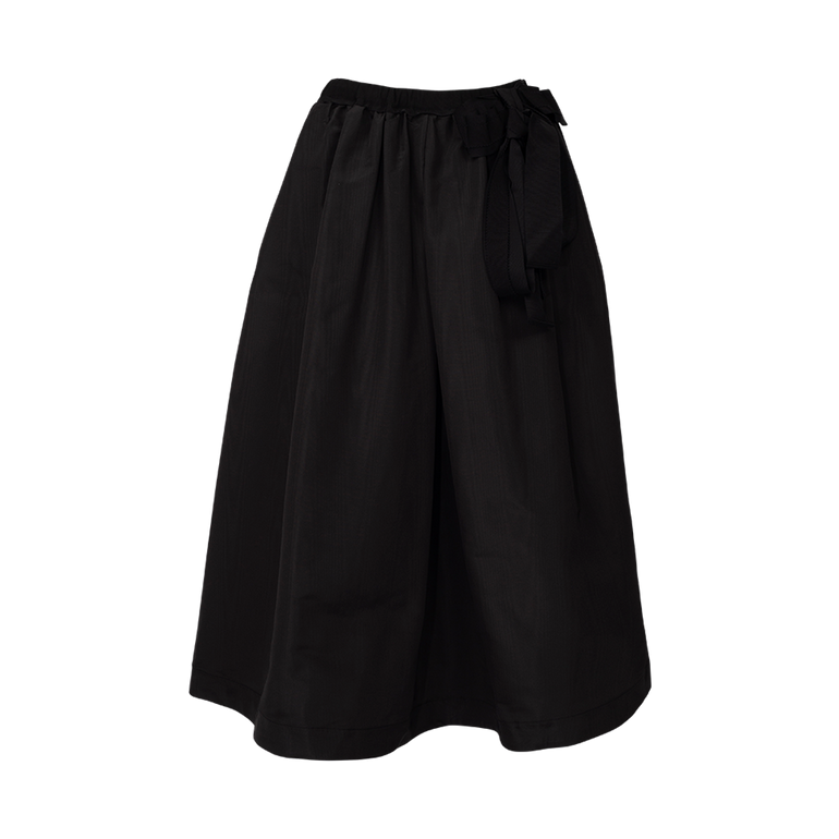 High-waisted midi skirt with gathered volume, bow detail at waist and soft pleating throughout.