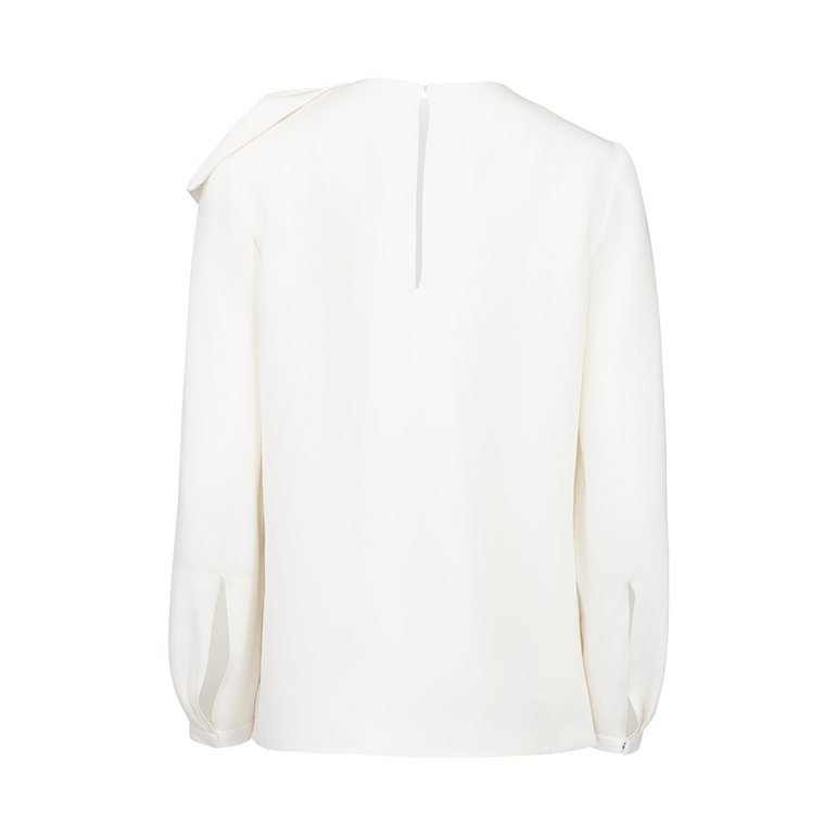 Long-sleeved shirt with round neckline, large bow embellishment at shoulder and keyhole and button closure at back.