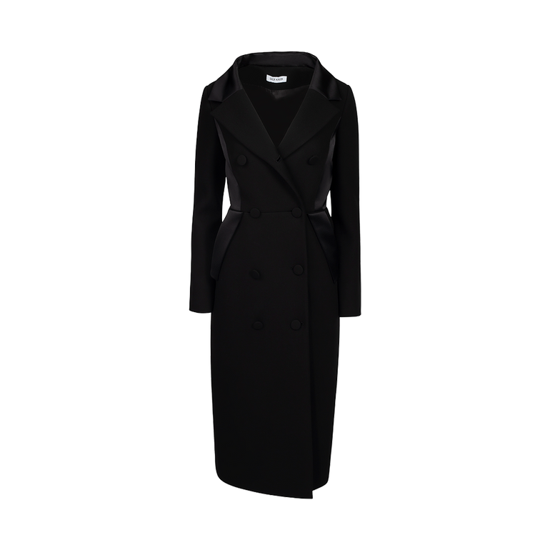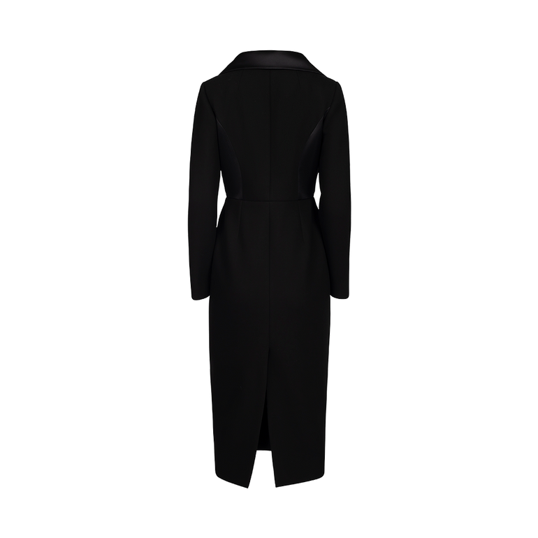 Tailored midi dress with satin detailing, notch lapels, double-breasted front, long sleeves and side flap pockets.