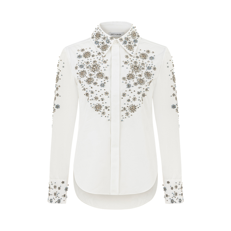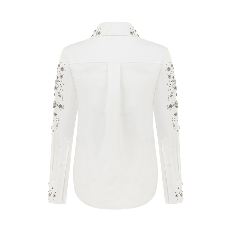 Classic shirt with button front, pointed collar, flower shaped embellisments, and curved hem. Long sleeves with button cuffs.