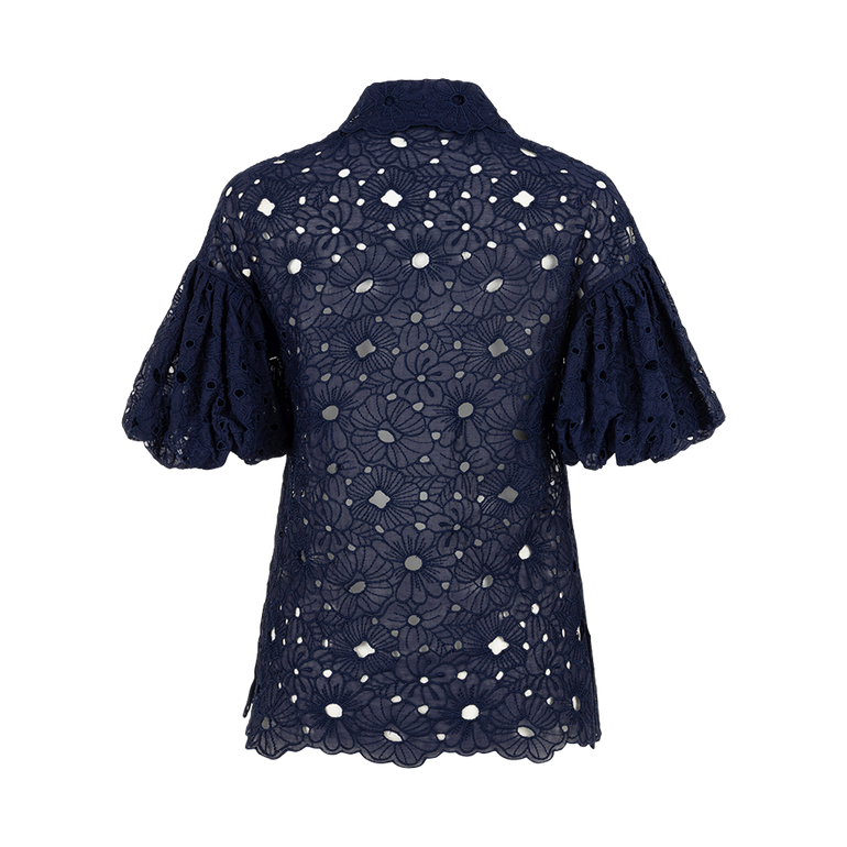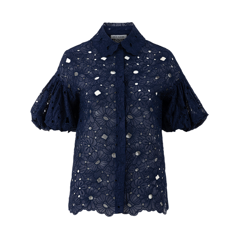Intricate floral embroidery with openwork details, sculptural puff sleeves and voluminous sihouette. Concealed button placket and pointed collar.