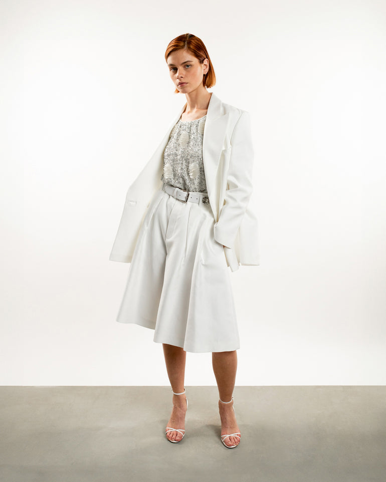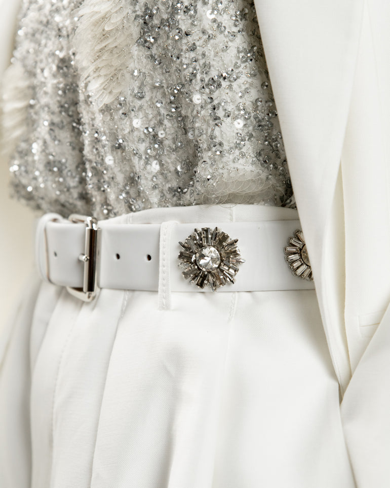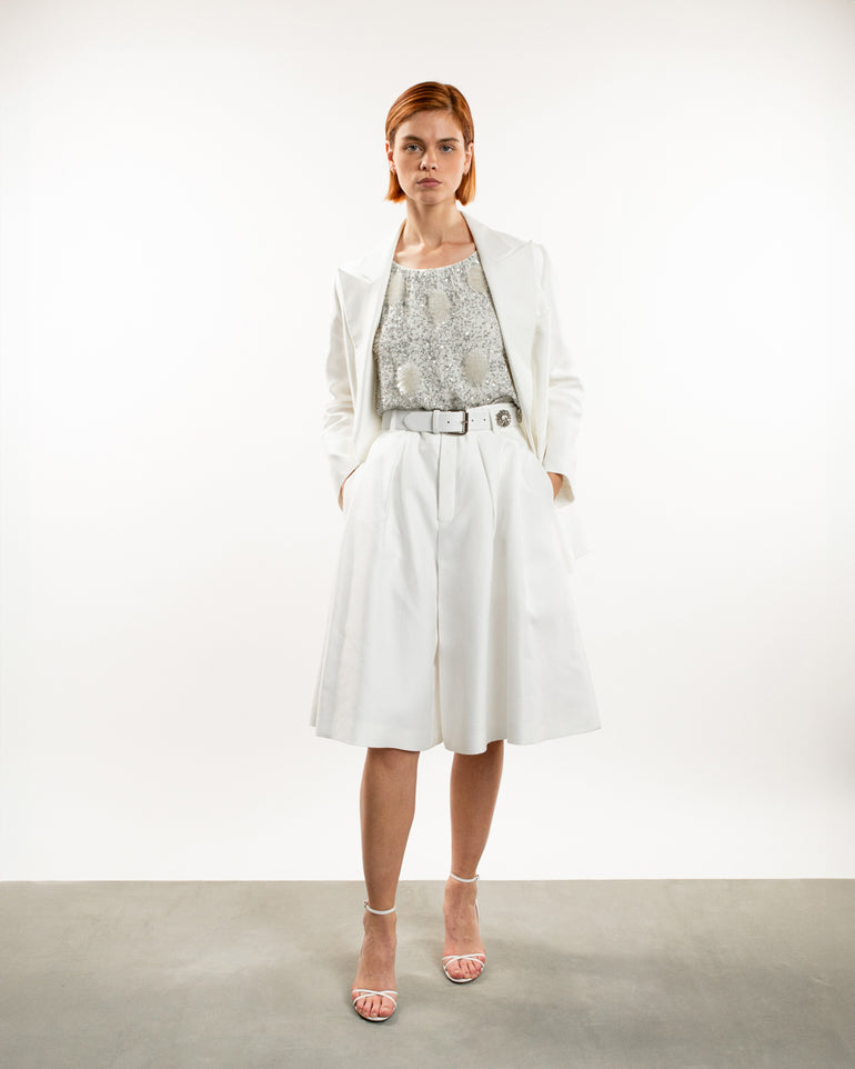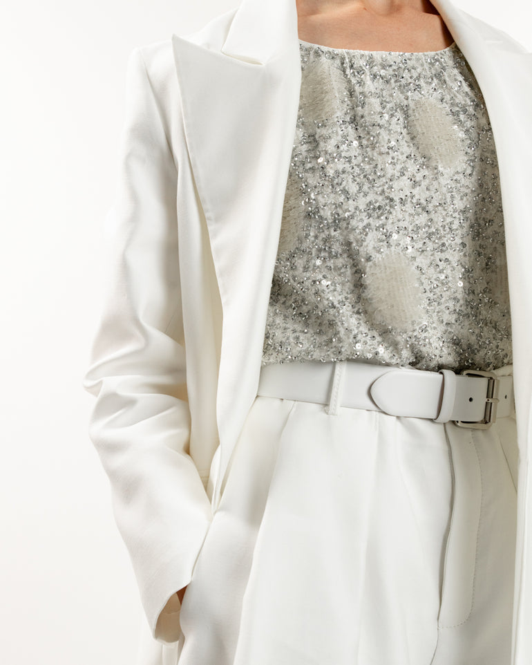 Sleeveless shirt in allover polka dot sequin embellishment with round neckline, V-back and two-way back zip.
