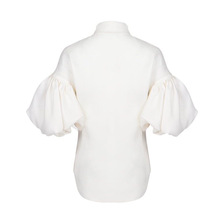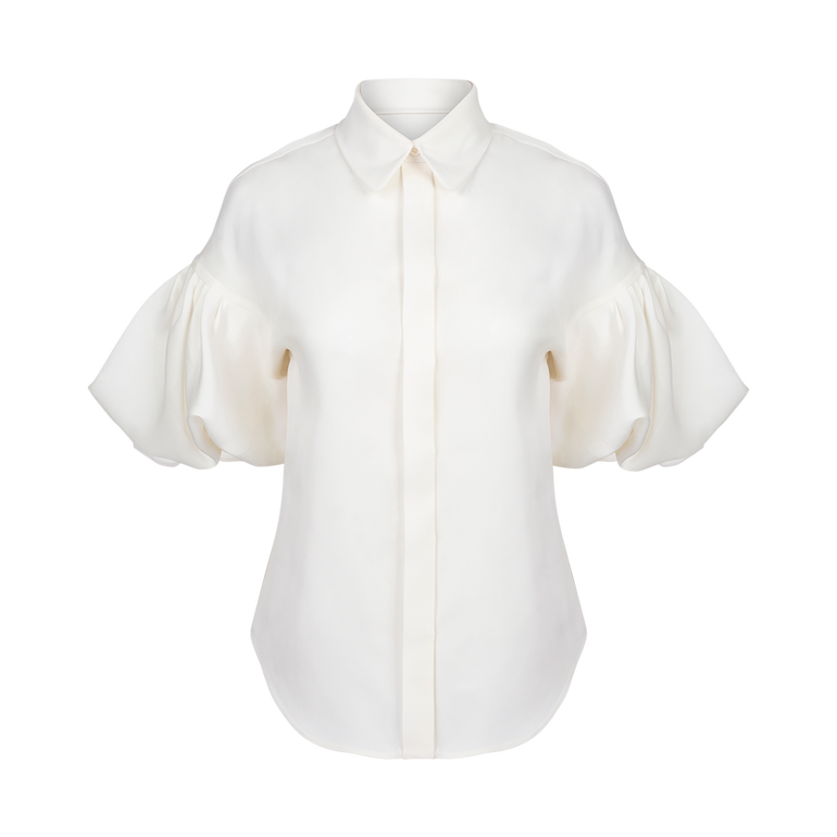 Blouse with voluminous puffed sleeves, classic collared neckline and concealed front-button placket.