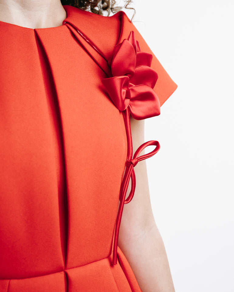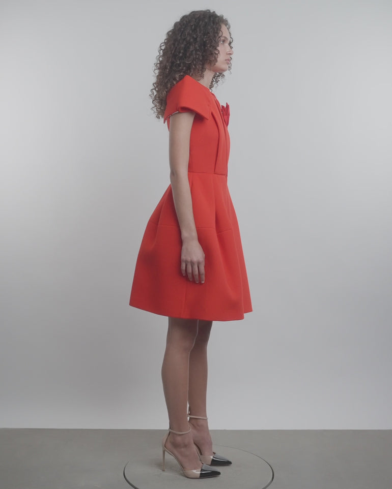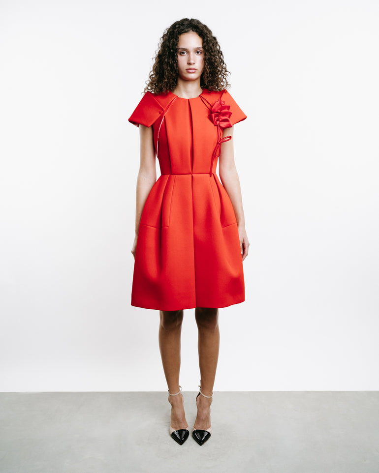 Midi dress in signature sculptural silhouette with A-line skirt, architectural pleats and hidden side pockets.