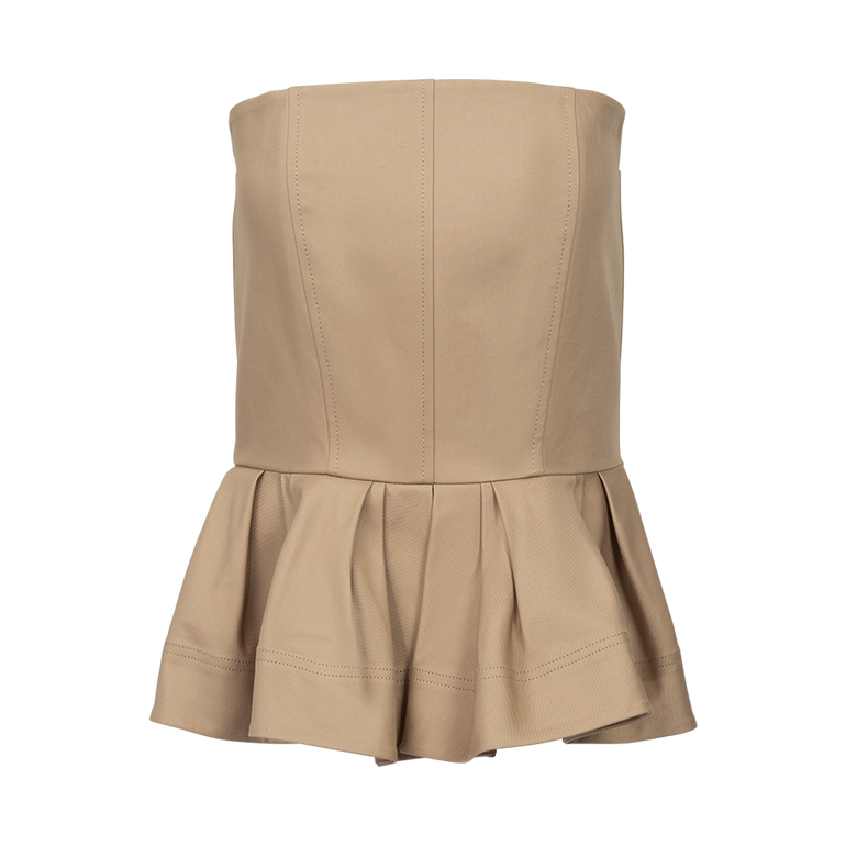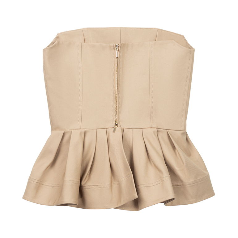 Strapless bustier top with a sculptural peplum hem. Tailored for a structured, waist-defining silhouette with layered volume. Concealed back zipper for a seamless finish.