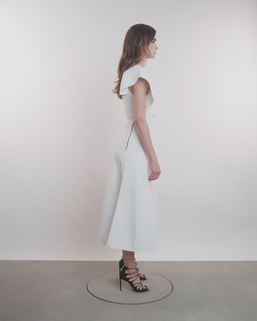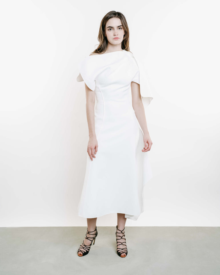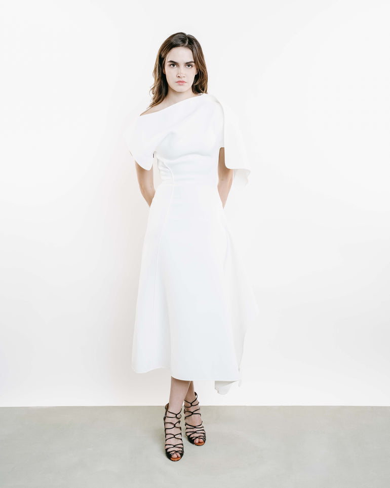 Midi dress with draped detailing across shoulder, uneven hemline and side zip.